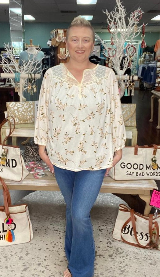 Sassy look, Curvy 3/4 Sleeve Floral Print Top w Crochet Details