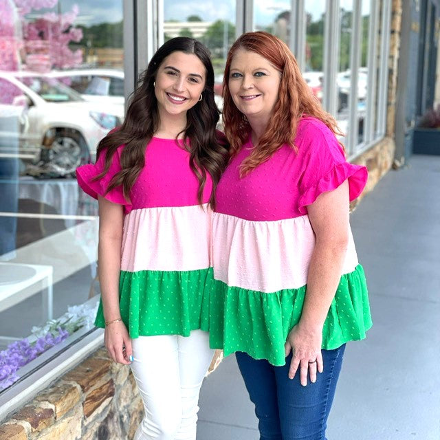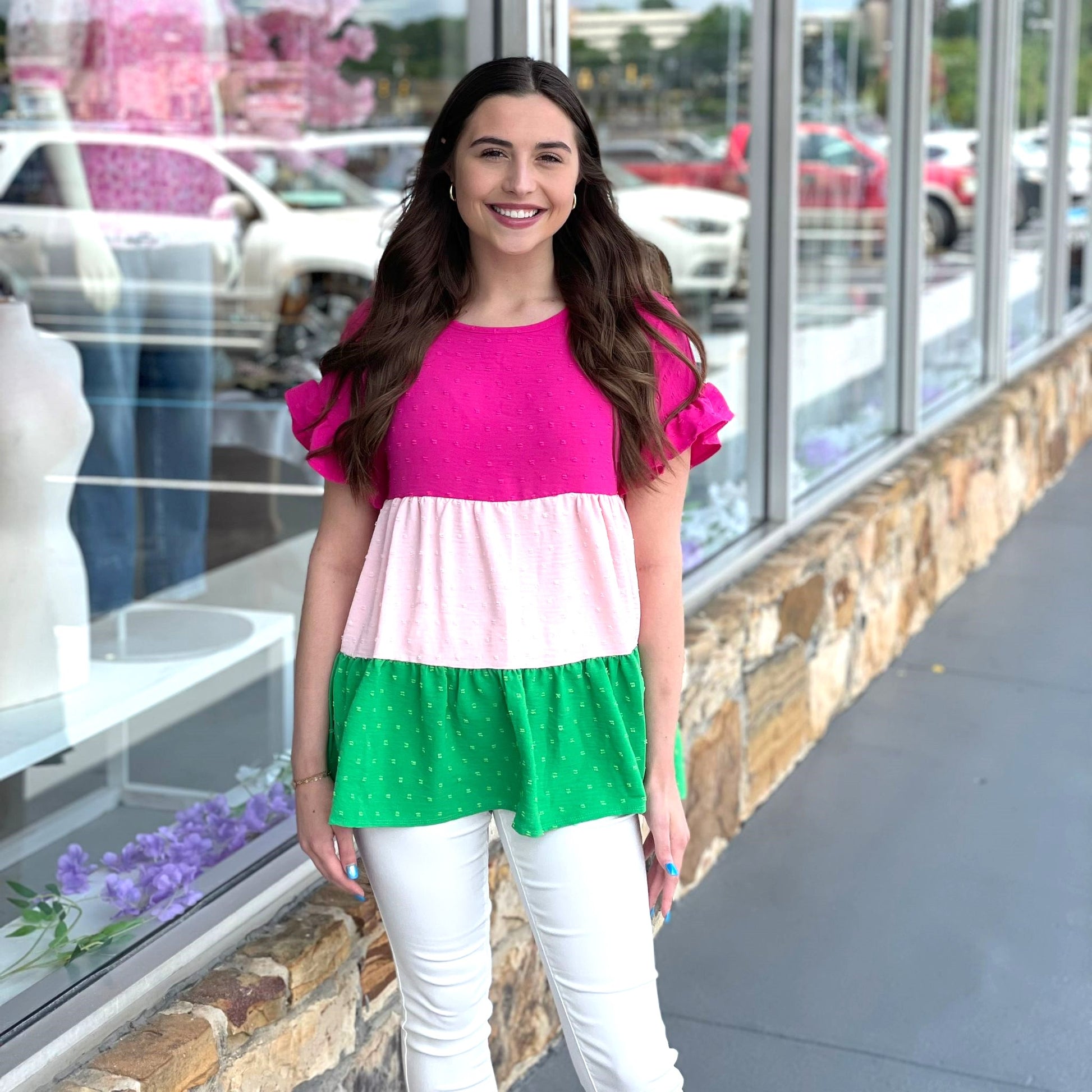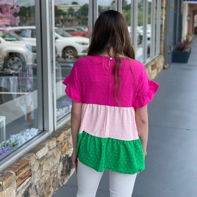 Amazing Swiss dot textured color block tiered swing tops w ruffled trim, short-sleeves