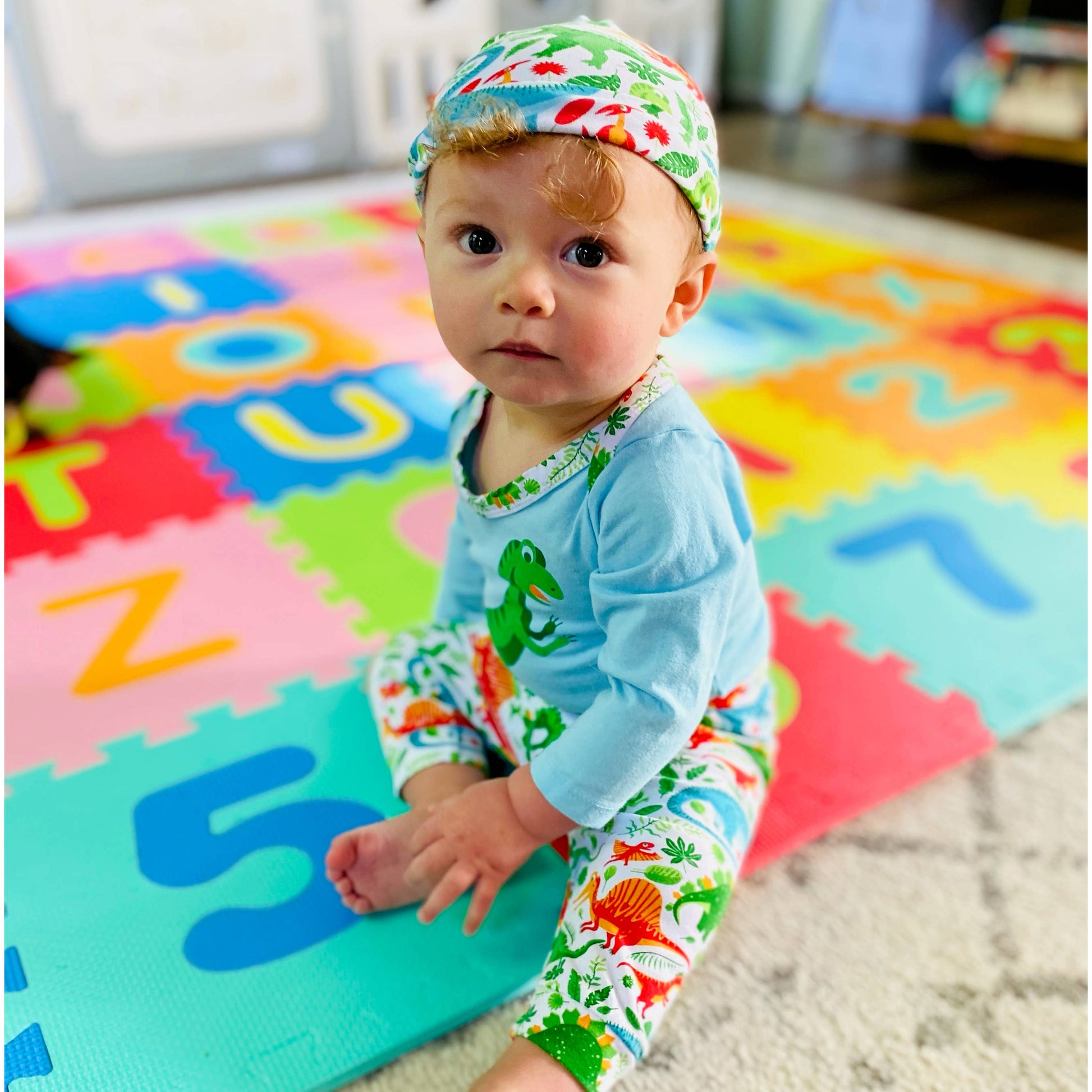 3 piece Dinosaur Set features a one-piece bodysuit with diaper button fastenings for easy diaper changing and a matching pair of joggers/pants with Head Cap. The top features an adorable Dinosaur silk screen appliqué. The 95% high quality Egyptian cotton and 5% stretchy lycra fabric is SUPER soft and comfortable. Premium dye's ensure that your outfit won't fade or run. Machine Washable. Great for Baby gifts!