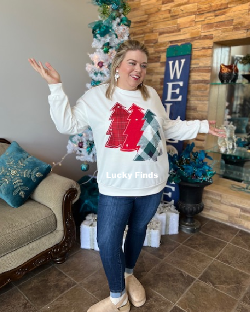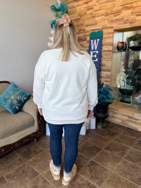 Elevate your holiday wardrobe with this sophisticated oversized sweatshirt, featuring an elegant pearl plaid Christmas tree patch. The relaxed drop-shoulder silhouette offers effortless comfort and contemporary style. Available in two generous sizes: S/M (fits sizes 8-10, with a 45" bust) and L/XL (fits sizes 16-18, with a 51" bust) in crisp white. Perfect for festive gatherings or cozy seasonal moments.