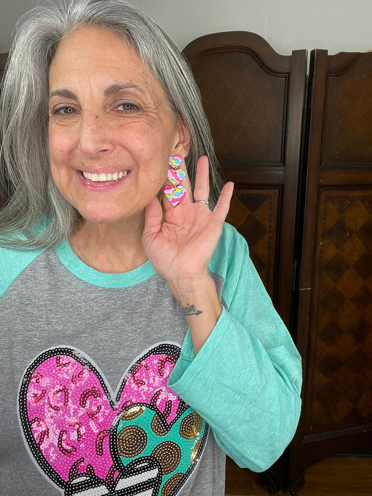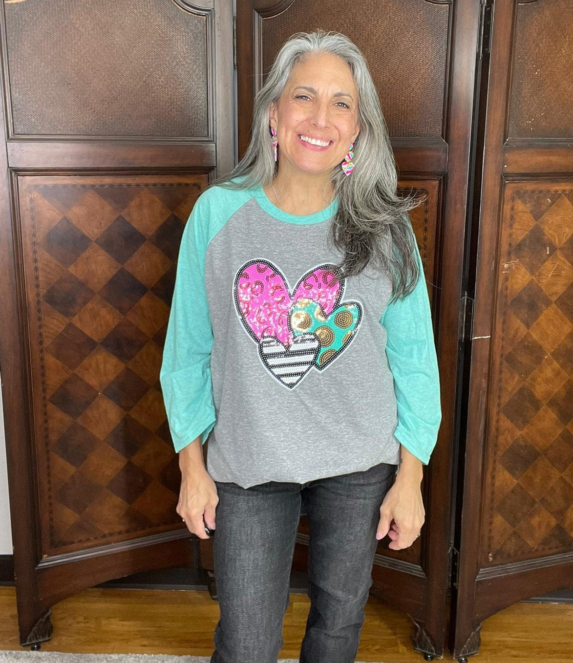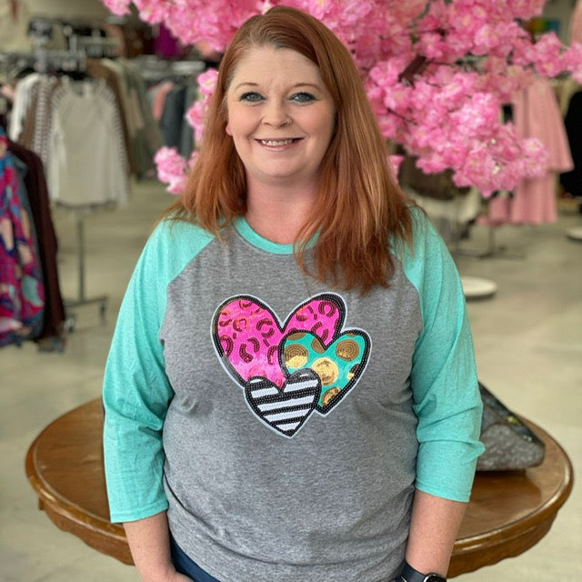 Triple sequin hearts design . Heather grey and aqua raglan sleeve Gildan Unisex shirt Medium thru 2XL