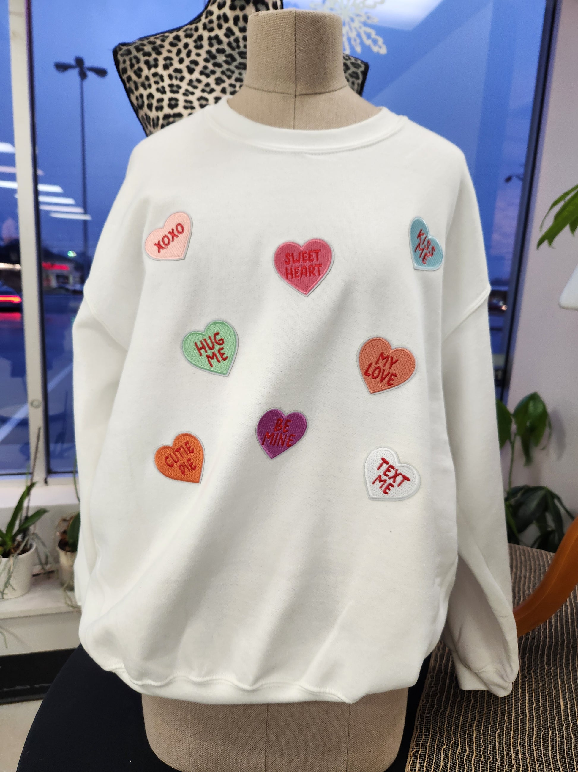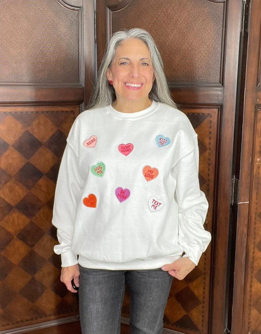Lots of Hearts Sweatshirt embroidered patches. White Gildan Unisex sweatshirt Medium thru 3XL