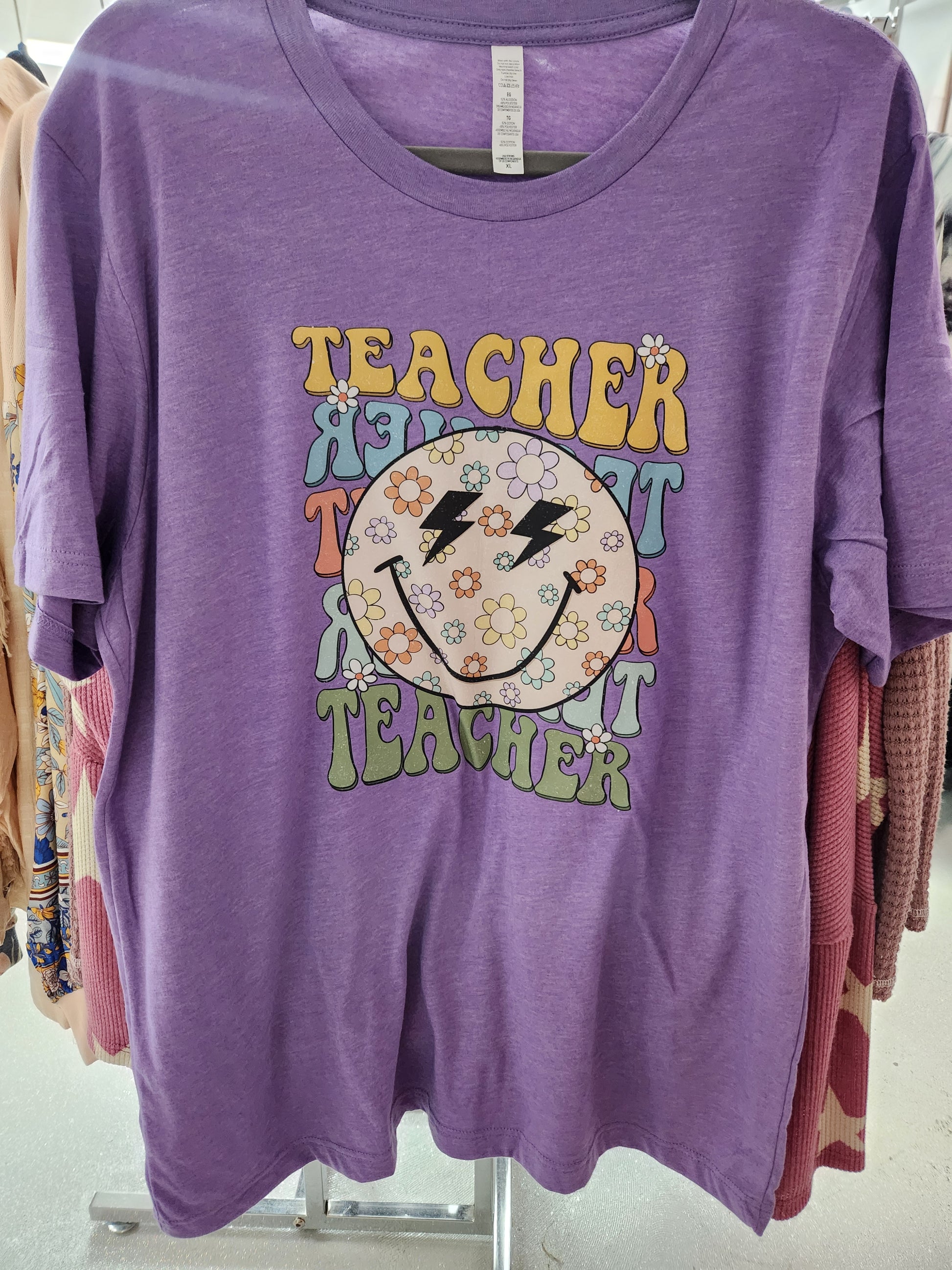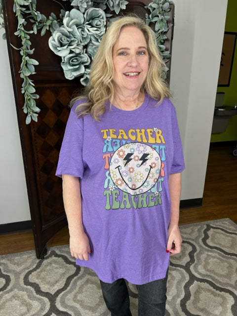 Heather Purple Gildan unisex tshirt with DTF Smile Face Teacher graphic. Avail in sizes Medium, Large, XL, 2XL