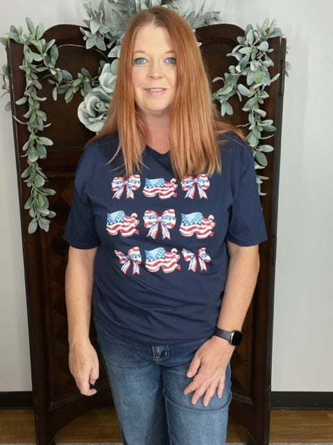 Grand Ole Flag & Bows on navy blue unisex t shirt in sizes Medium thru 3XL CP544