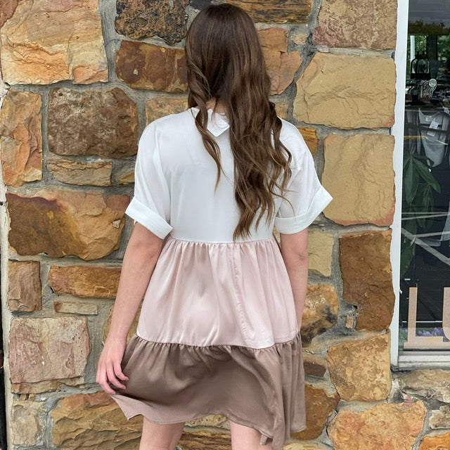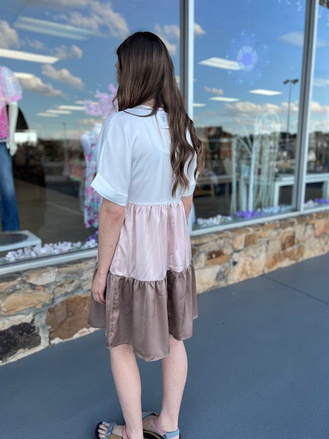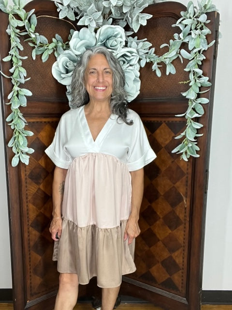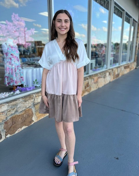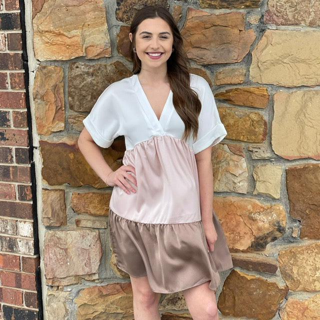 Gorgeous V-neck Tiered Color Block Dress w Short Cuff Sleeve