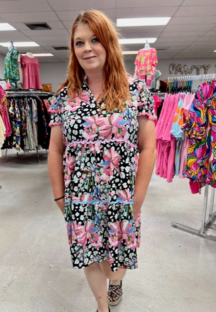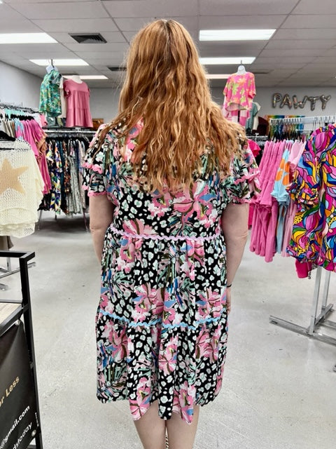 Amazing FLoral Print Ric-rac Trim Short Sleeve Flared Dress