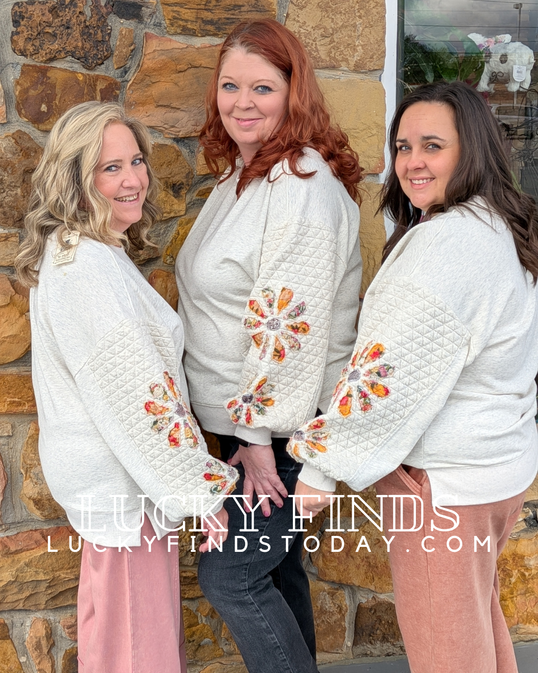 Vintage Oversized Washed Quilted Terry Pullover Top w Floral Sleeves Patches, Drop Shoulder, Side Slits