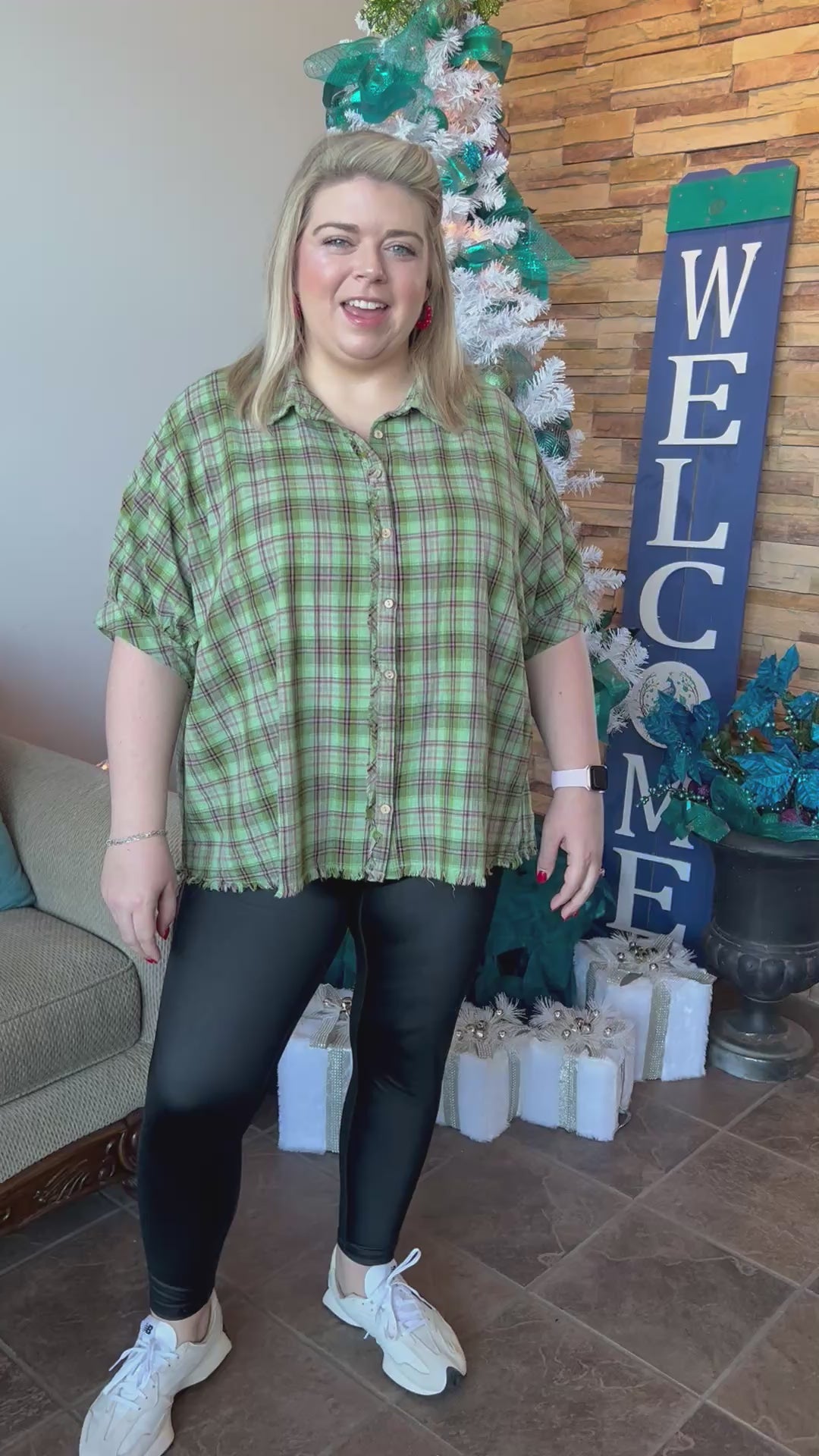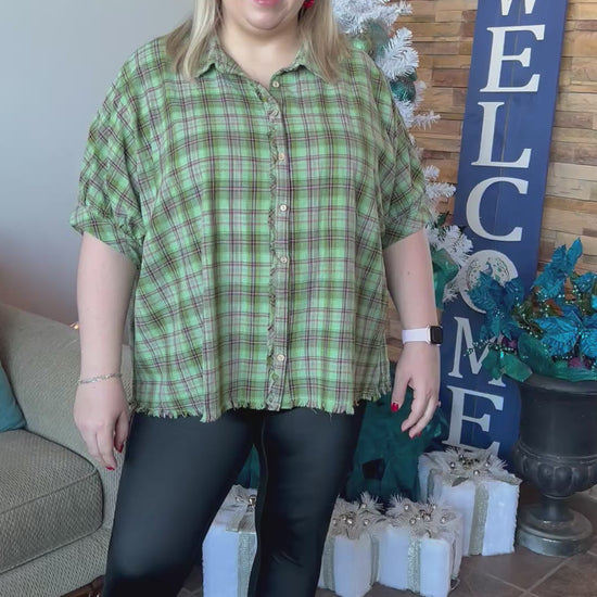 Trendy Oversized Plaid Collared Button Down Top, Boxy Cut, Fray Hem, Dolman Half Sleeves