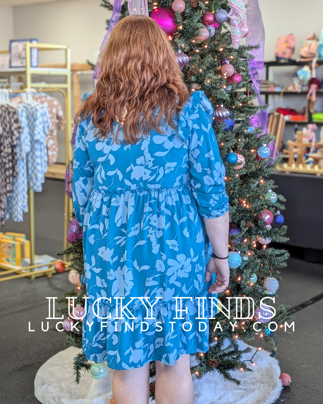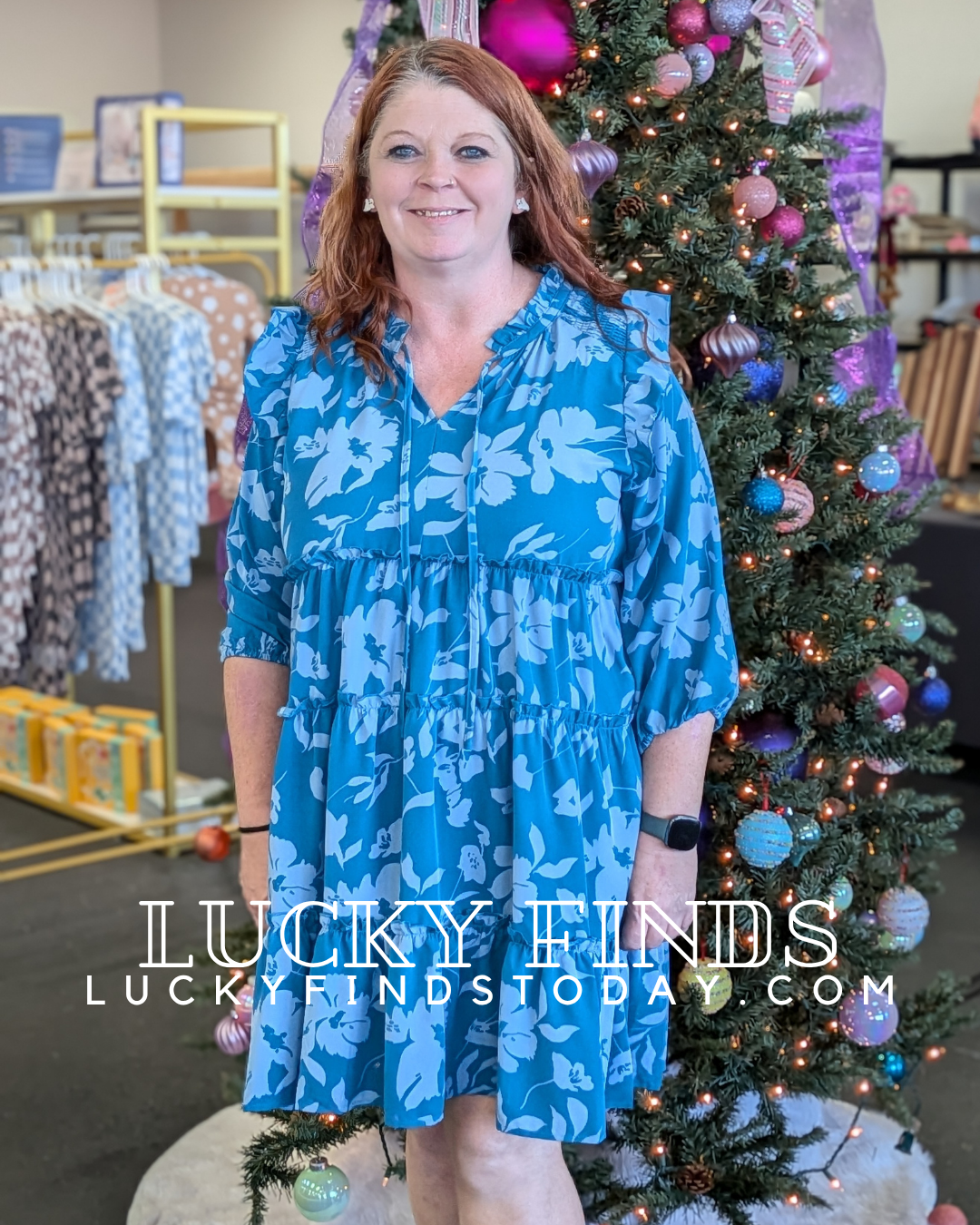 Trendy Tiered Floral Print 3/4 Sleeve Ruffle Neck Tie Dress