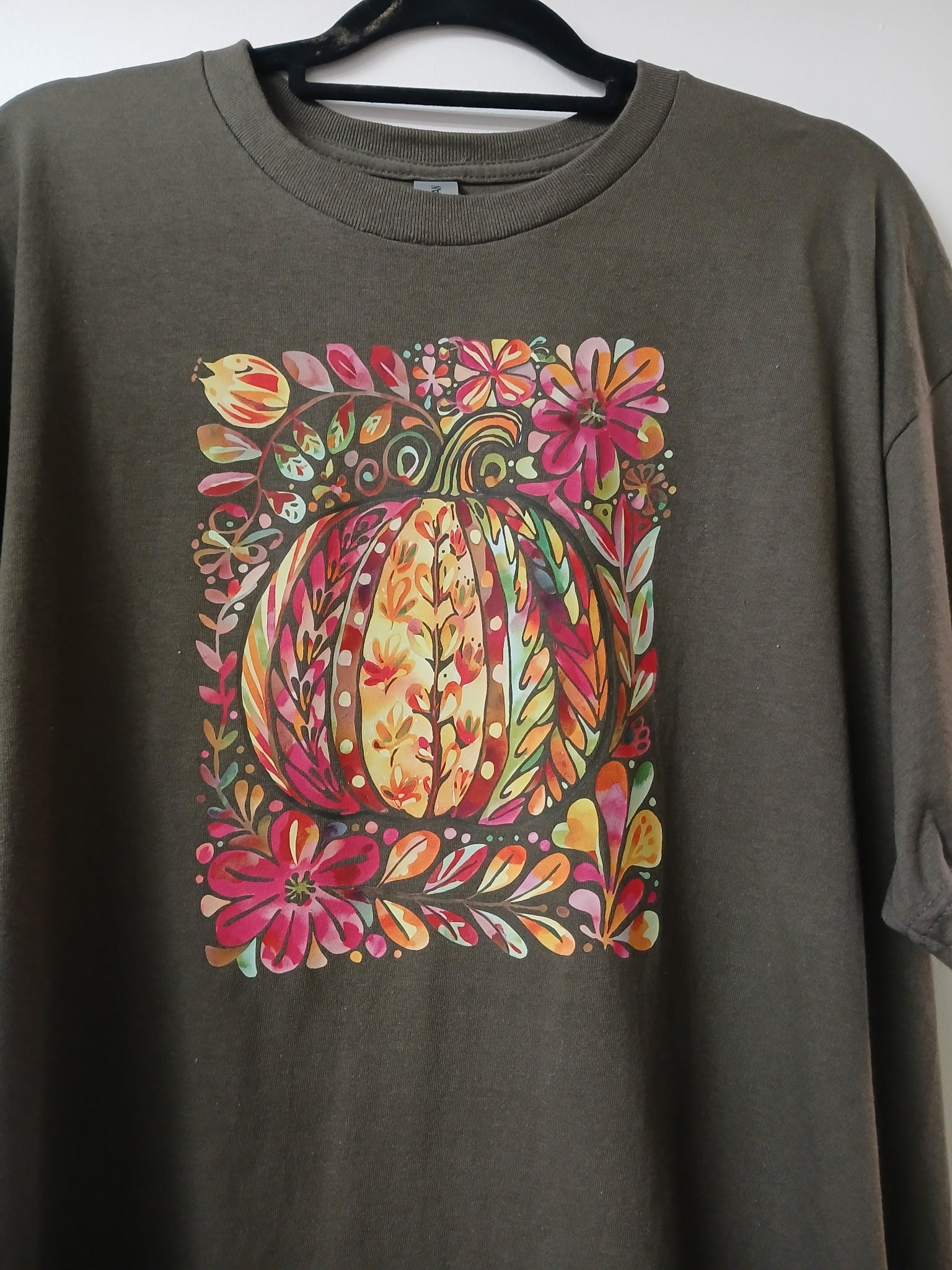 Beautiful abstract flowers and leaves with a Pumpkin perfect for Fall. Show on an olive green gildan unisex t shirt avail in XL. Also avail in Black in a full size run of Medium thru 3XL.