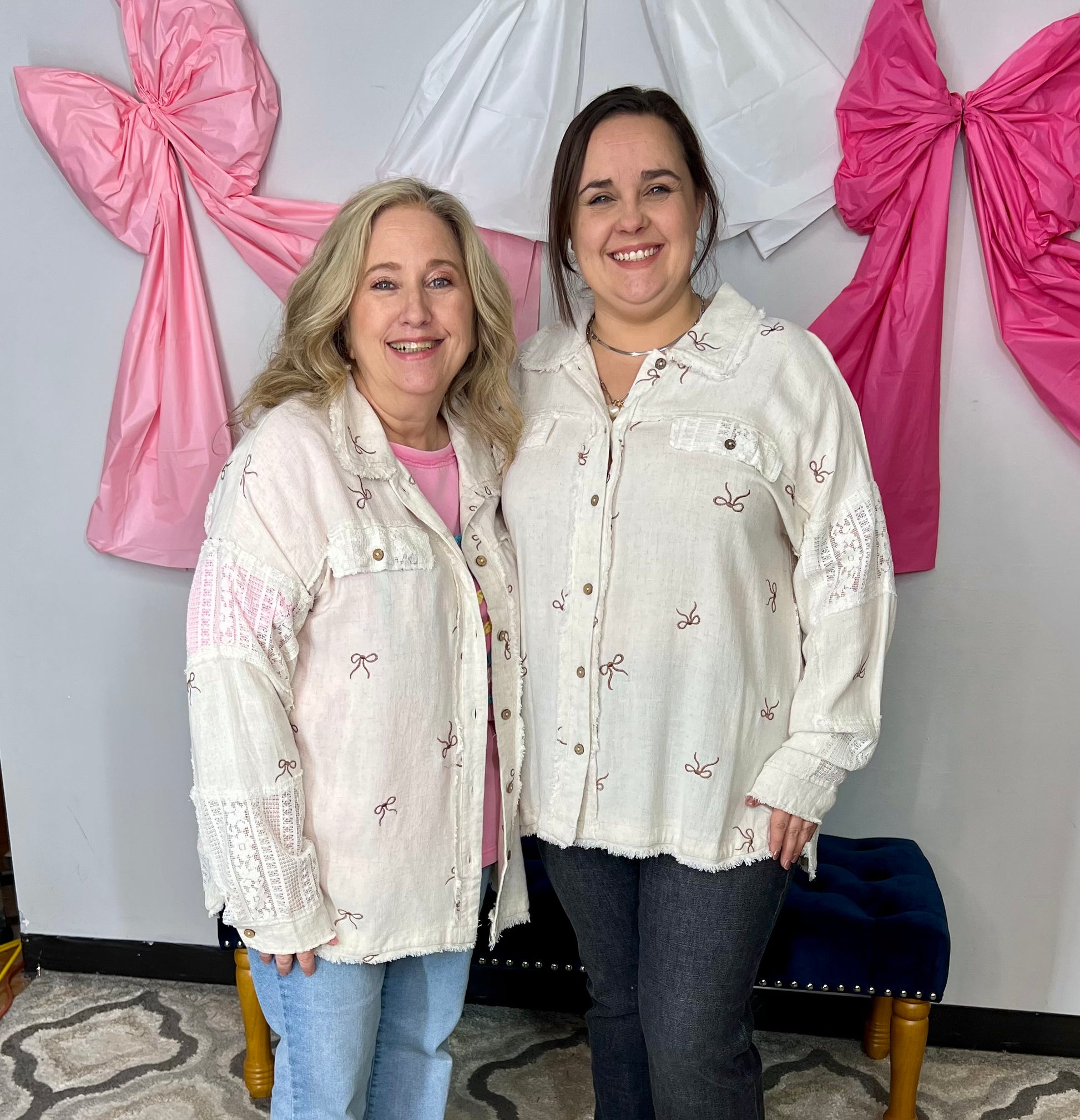 Casual Washed Bow Print Linen Button Down Top w Lace Trim Details, Frayed Hem & Chest Pockets