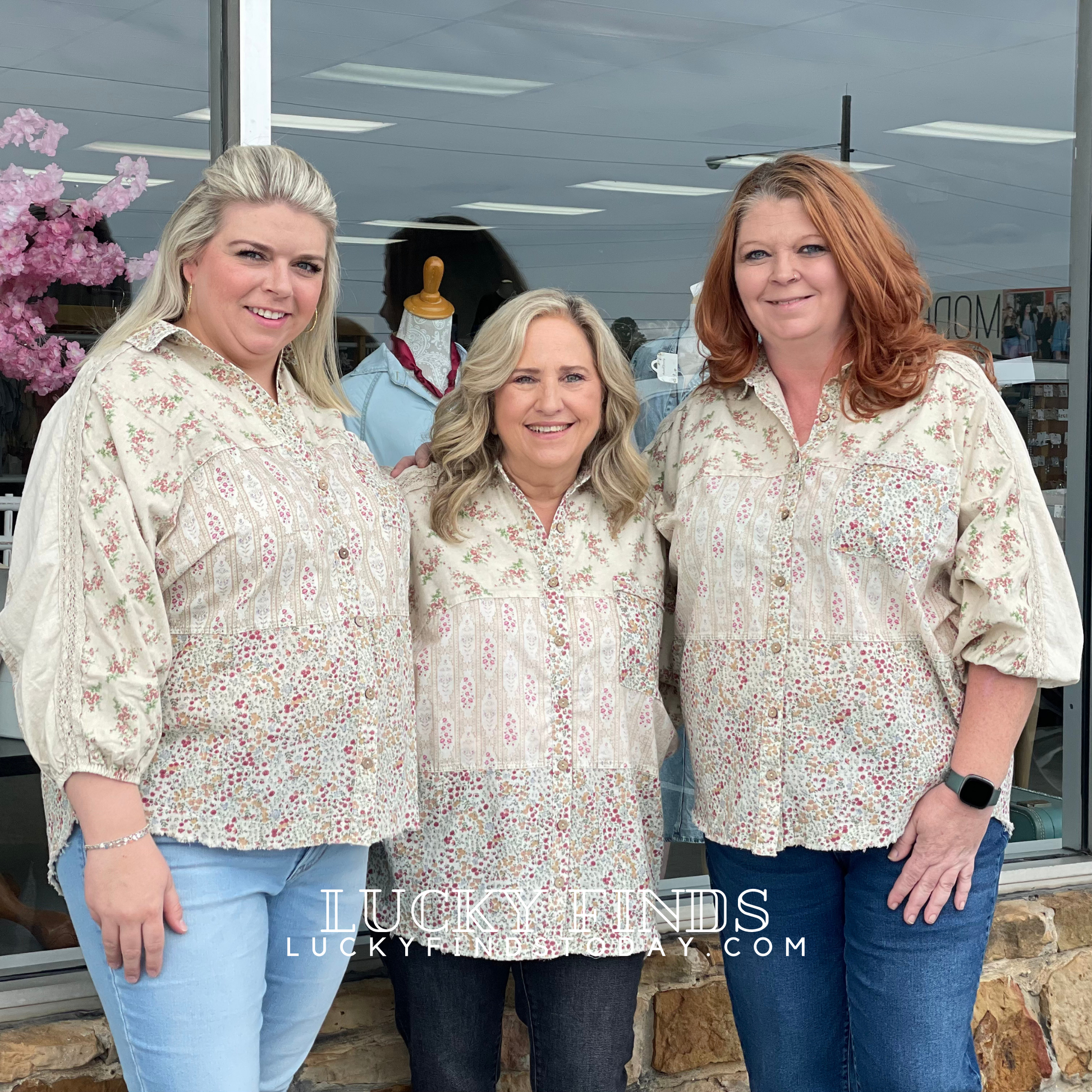 Gorgeous Washed Mix Floral Patchwork Button Down Shirt, Drop Shoulder Relaxed Boxy Fit