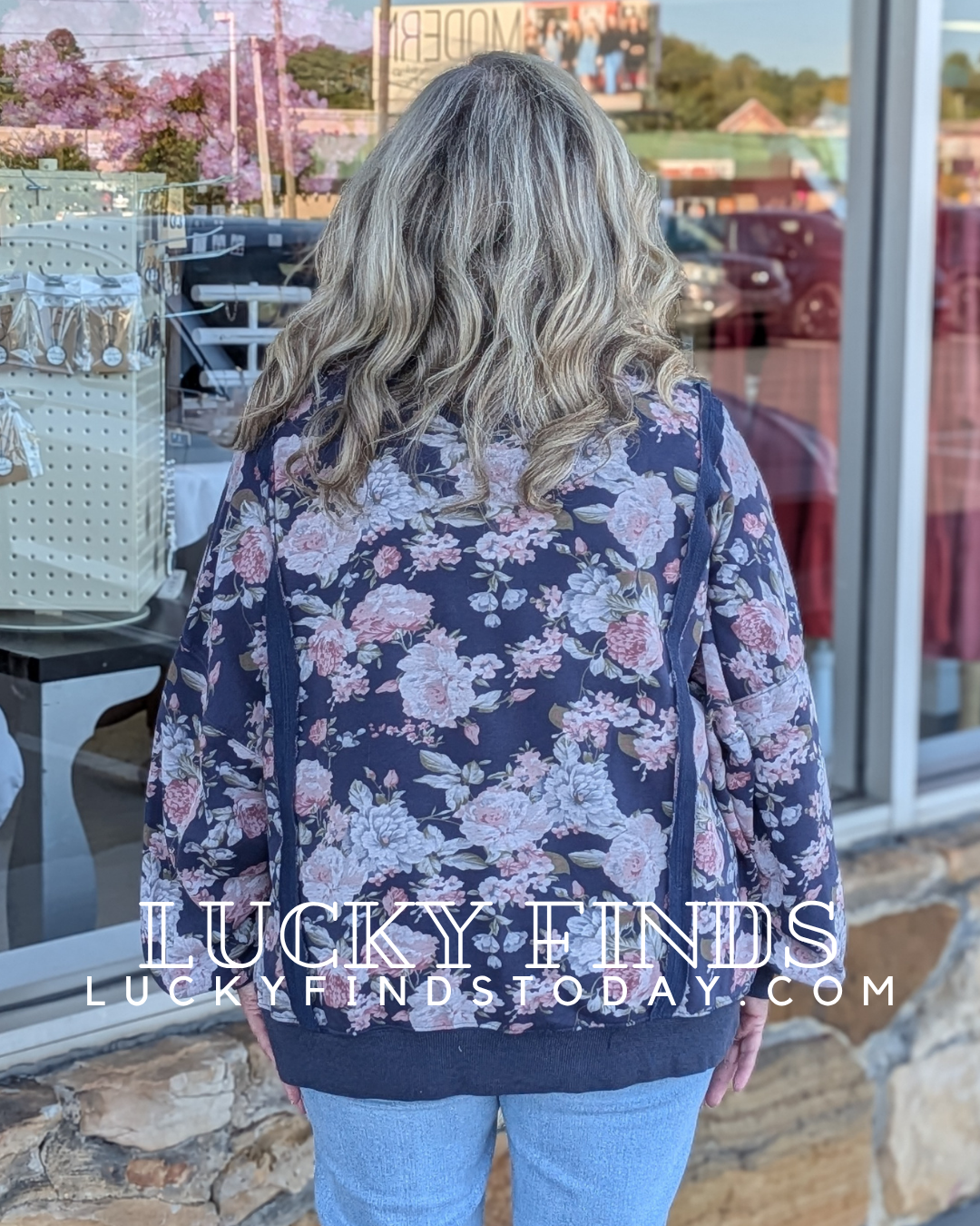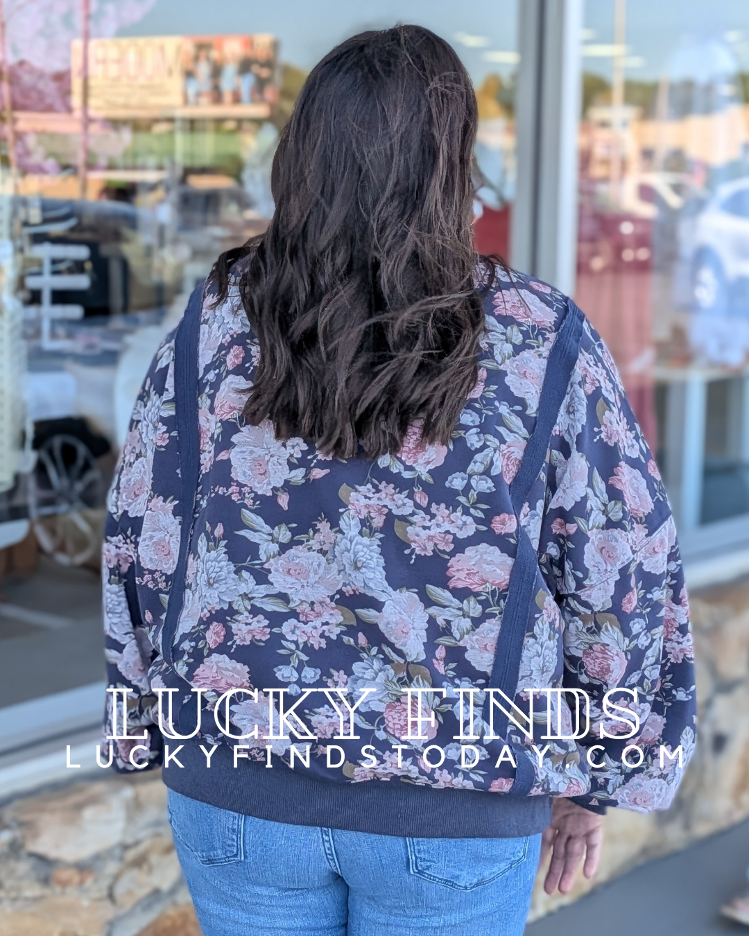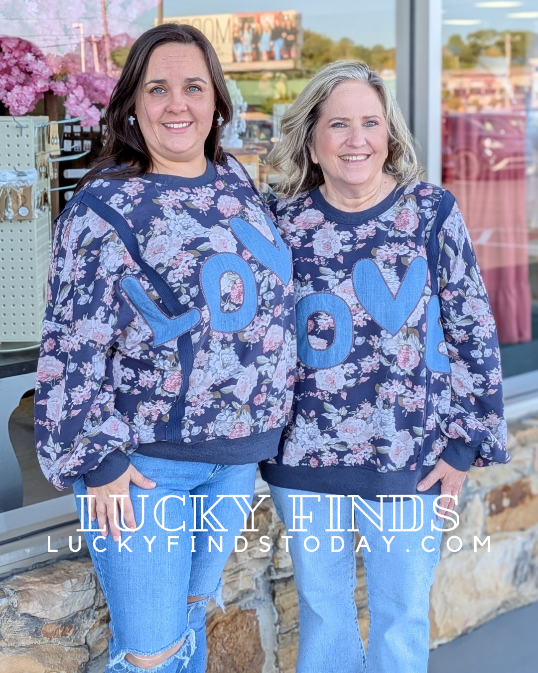 Gorgeous Washed Floral Love Denim Applique Pullover Top w Floral Print All Over, Balloon Sleeve, Relaxed Loose Fit