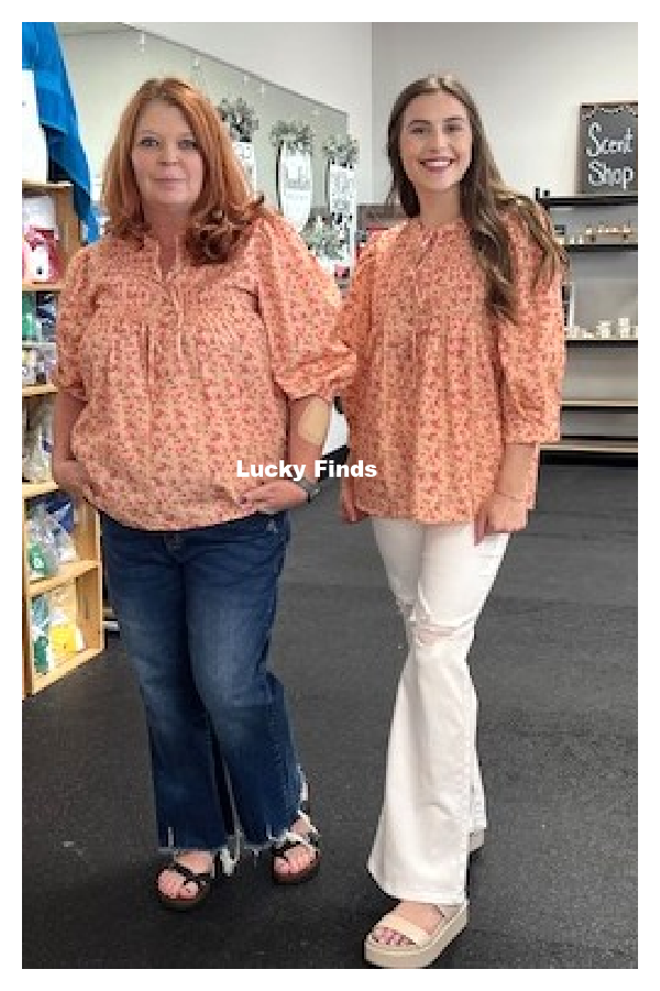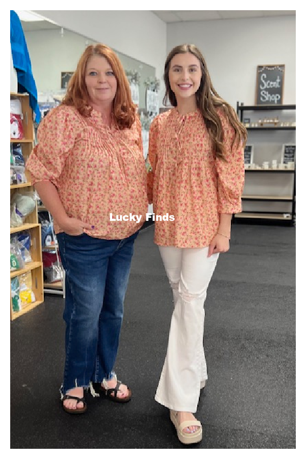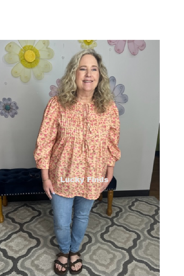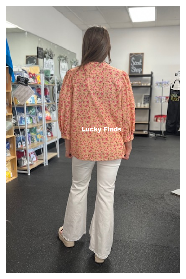 *featuring a peach base sprinkled with ditsy florals and playful bow closures down the front. The accordion pleats and balloon sleeves add just the right amount of flair, making it the perfect piece for those trendy vibes or Sunday brunch with friends.