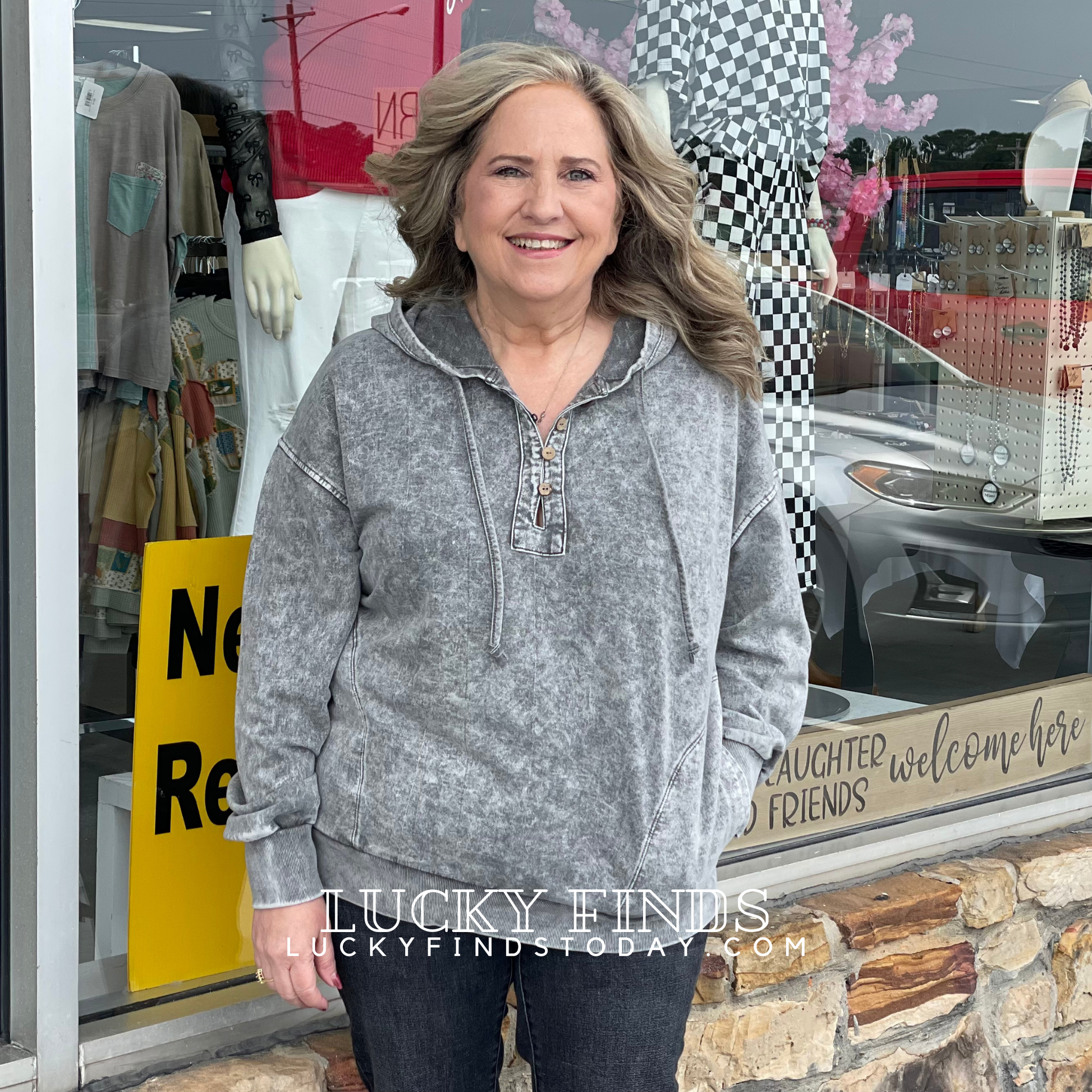 Trendy Washed Henley Knit Hoodie Top w Pockets & Draw Strings