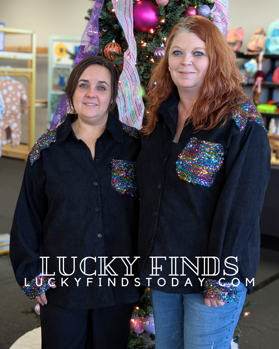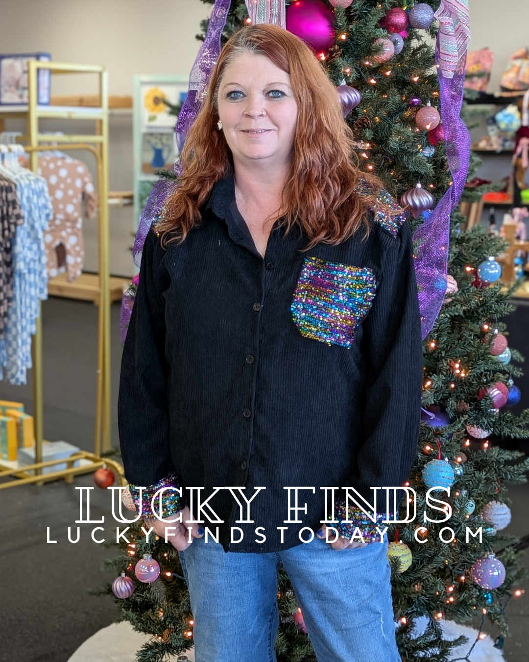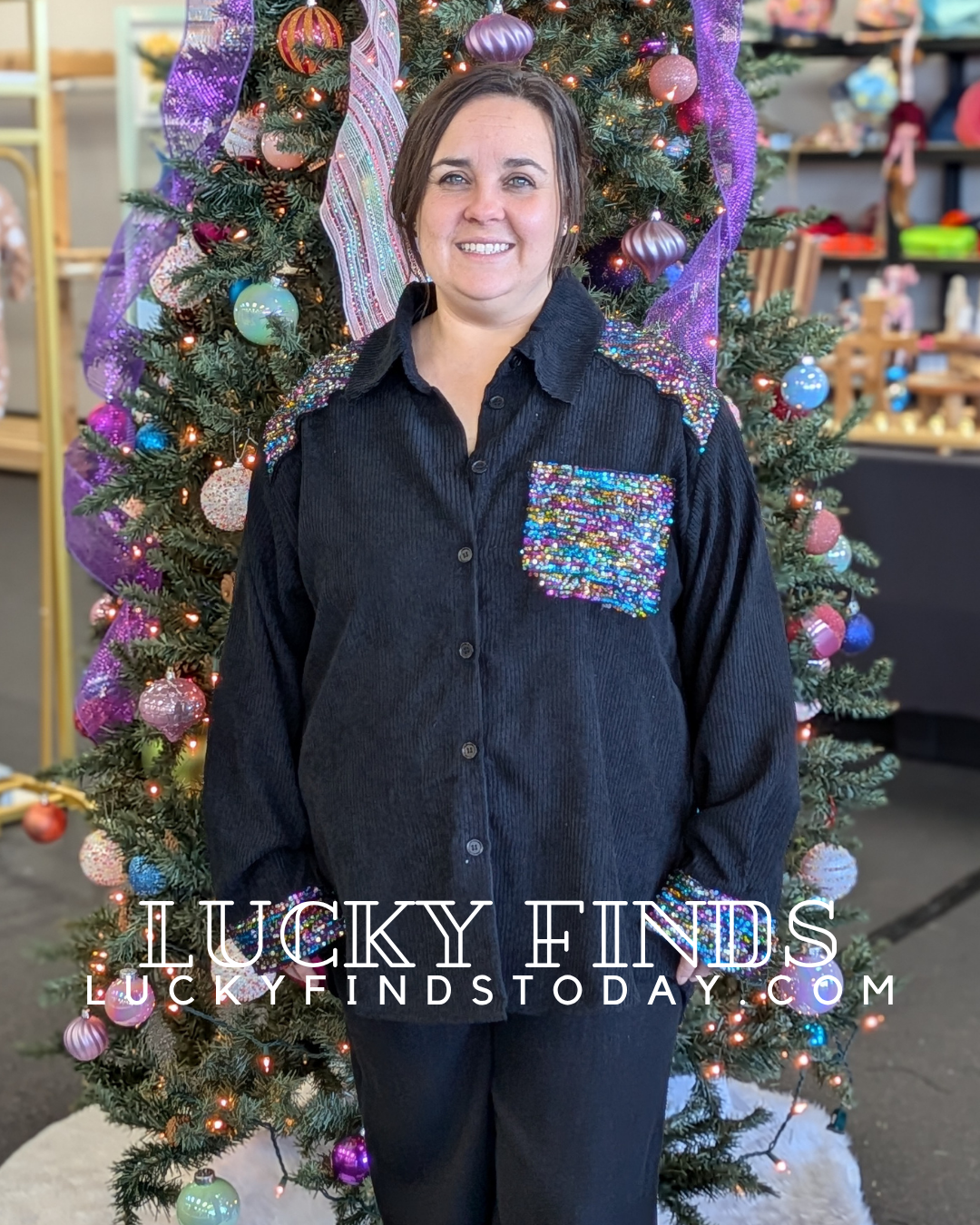 Eye-Catching Fun Corduroy Sequin Details Shacket w Chest Pocket, Button Down