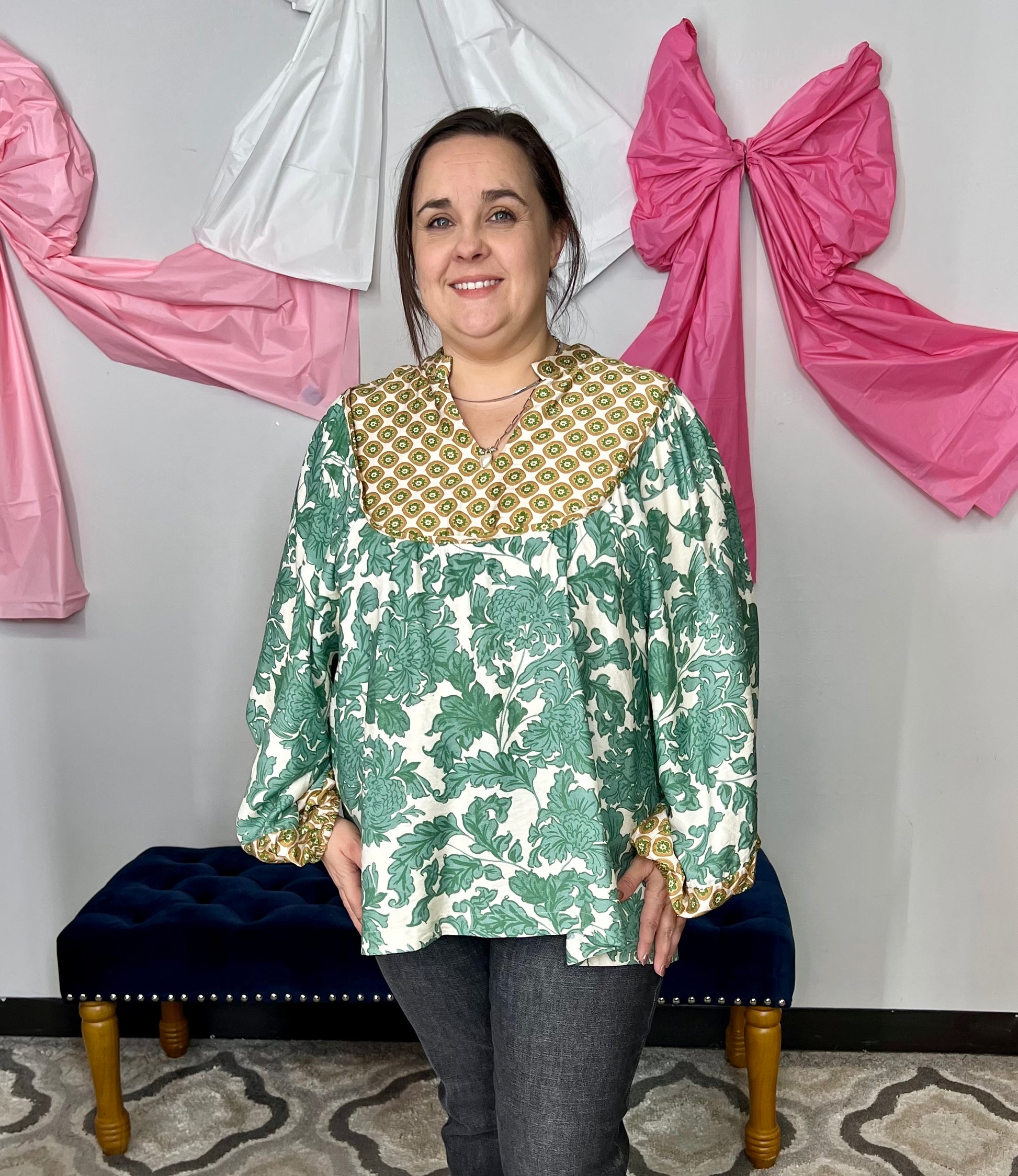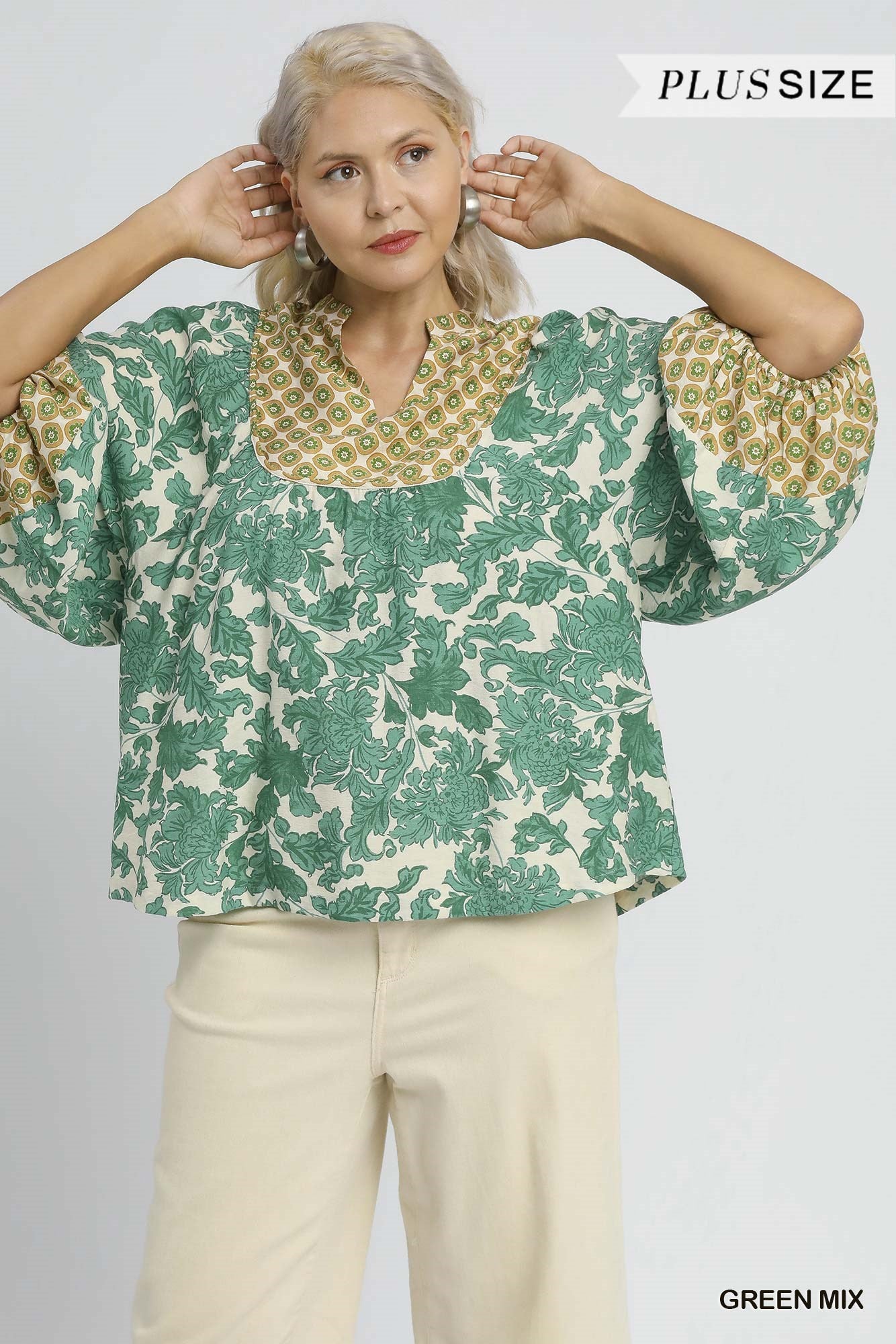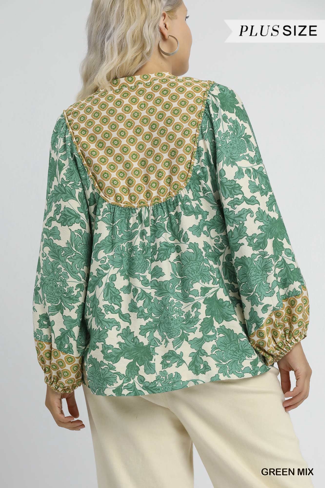 Gorgeous Abstract Print Top with Bishop Sleeves, Split V-Neck, Rounded Yoke, Relaxed Fit