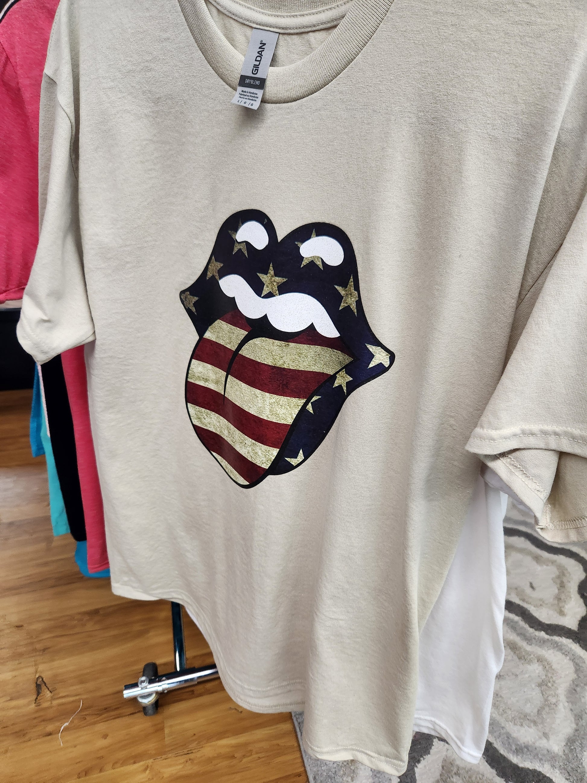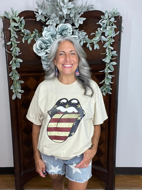 Rock & Roll Red White and Blue Tshirt in Sand unisex in sizes Small thru 3XL CP545