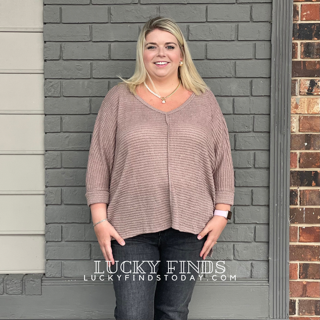 Comfy Oversized Waffle Knit Top W Side Slits, Hi-Low Hem & 3/4 Sleeve,