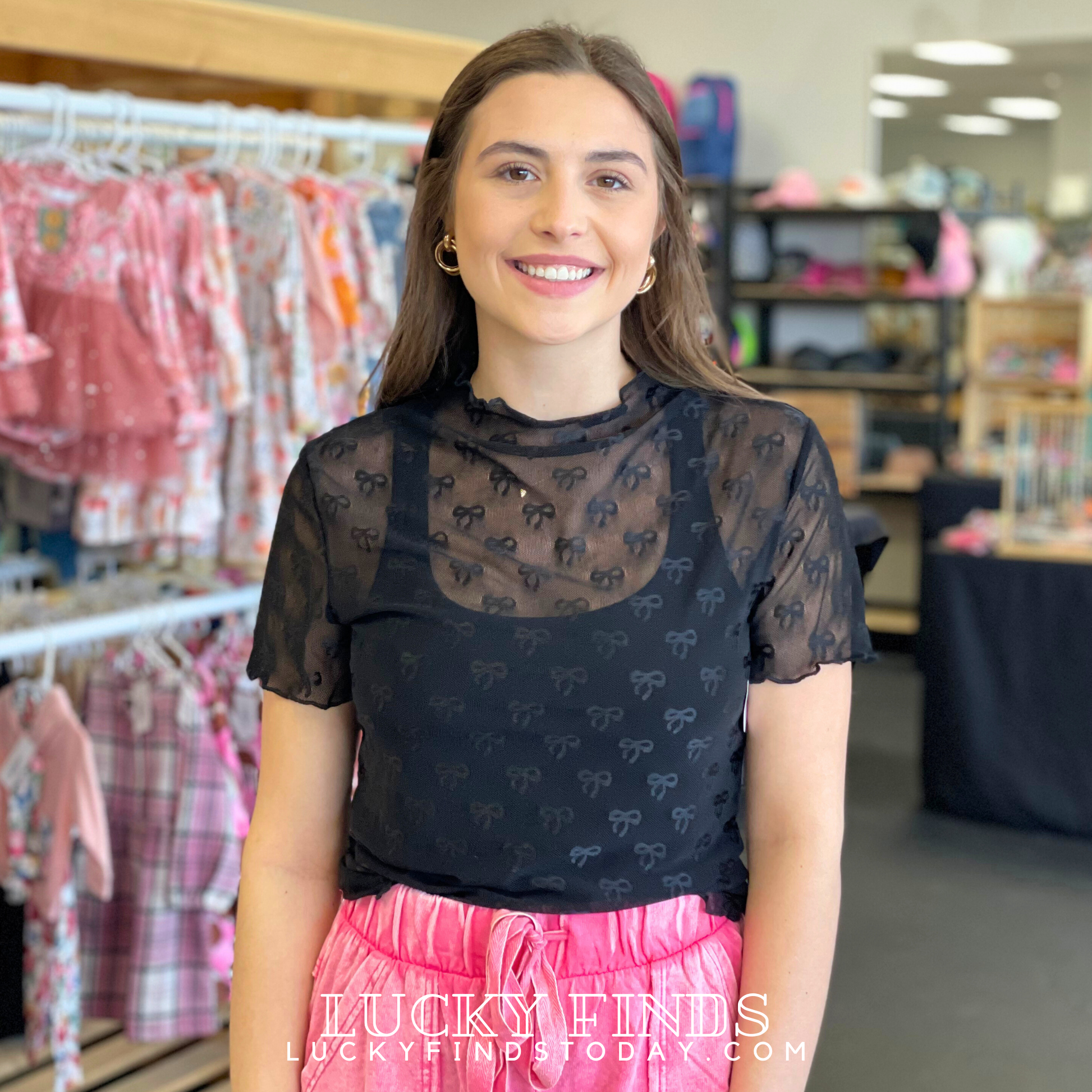 Stylish Stretchy Mess Bow Pattern Short Sleeve Top