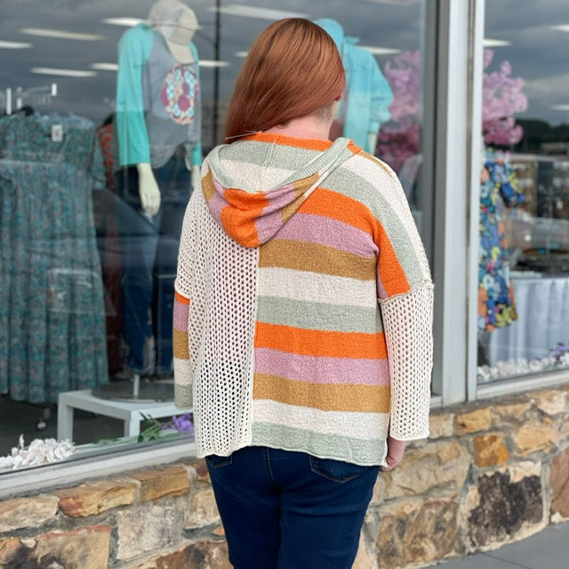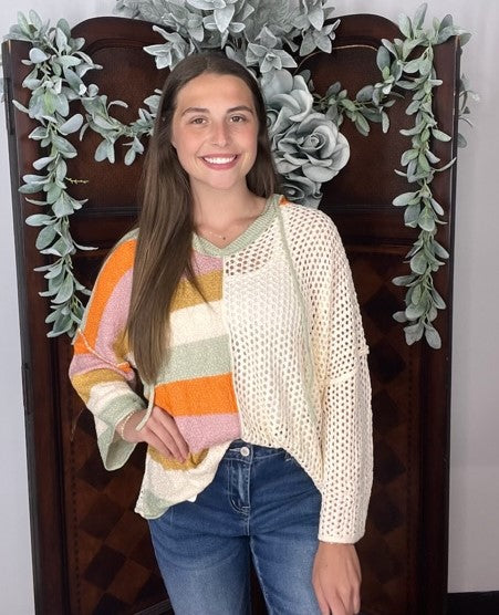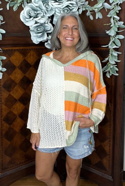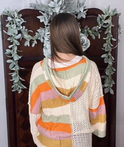 Fun oversized crochet colorblock Hooded sweaters, drop shoulder v neck
