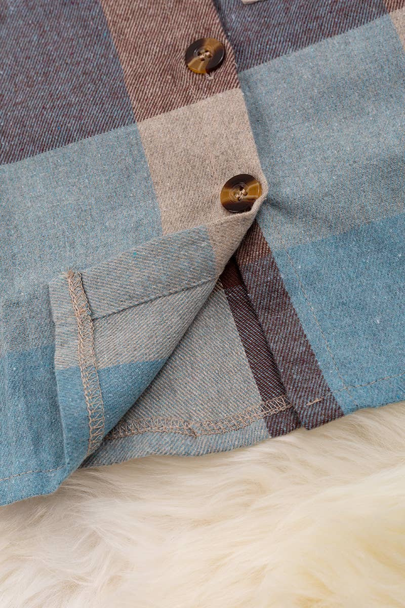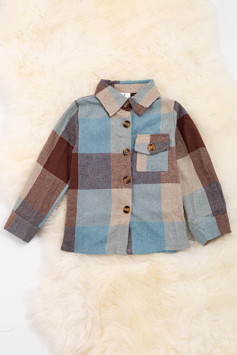 BLUE AND BROWN BOYS PLAID BUTTON UP SHIRT WITH SUPER SOFT MATERIAL.