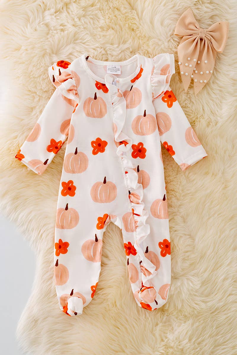 This onesie features a sweet pumpkin print on a crisp white background, adorned with delicate ruffle trim. Soft and stretchy, it's perfect for keeping your baby comfortable and stylish.
