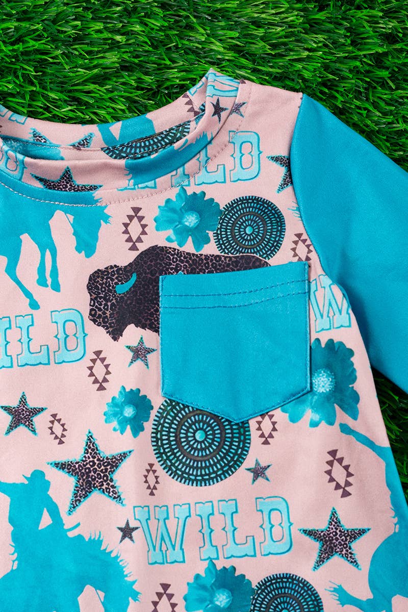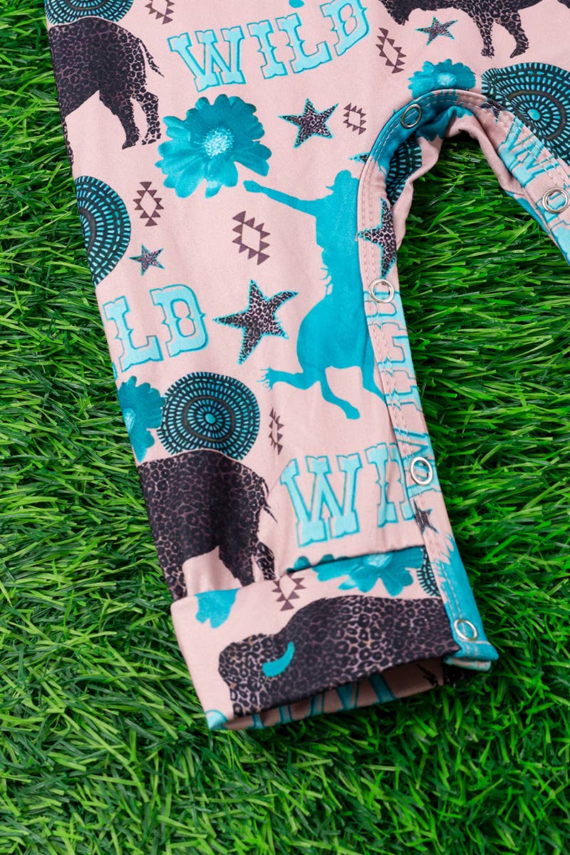 WESTERN WILD BISON PRINTED INFANT ROMPER WITH TURQUOISE SLEEVES