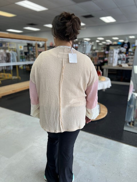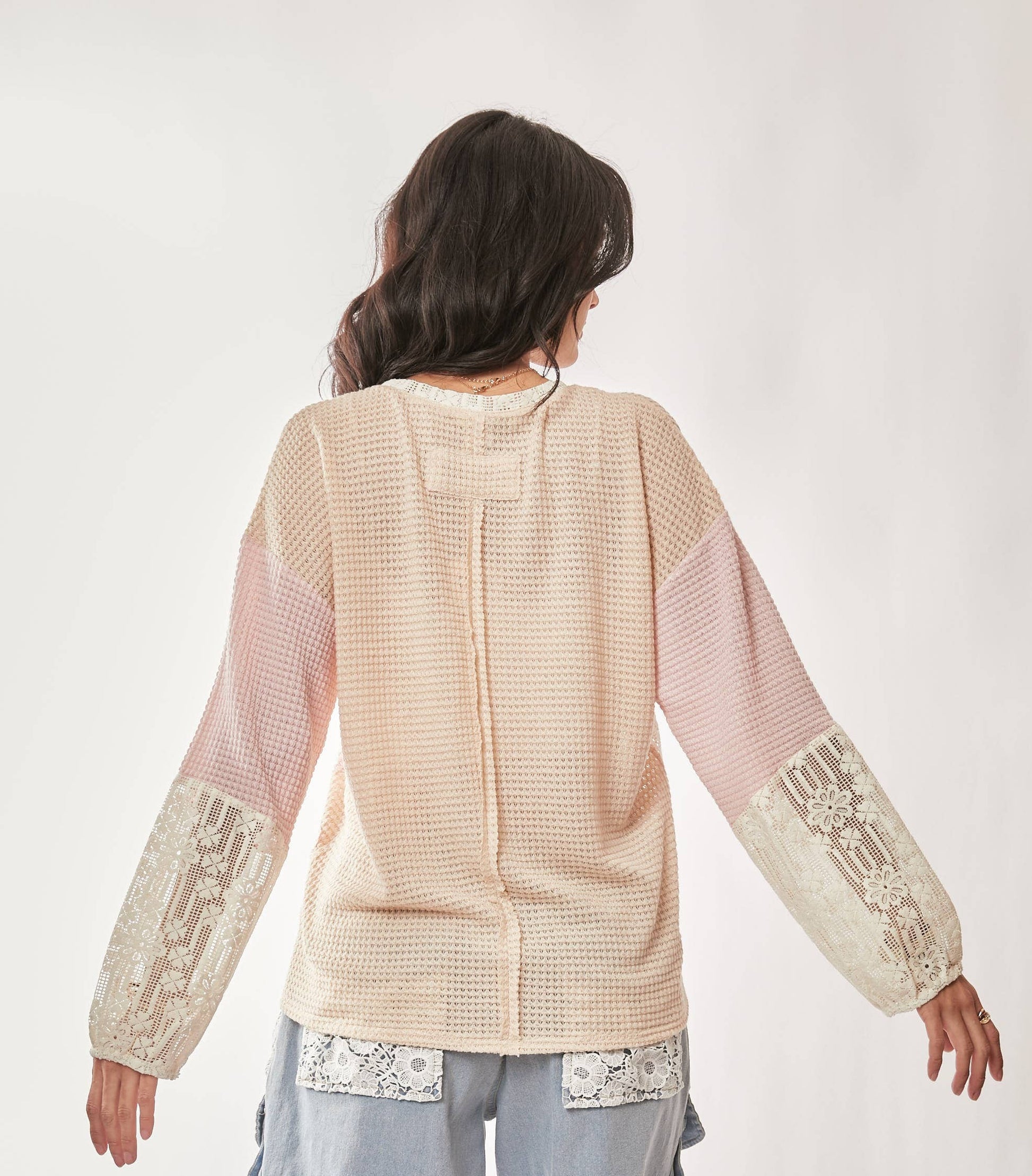 *A romantic mixed-texture top featuring a floral patchwork design with lace contrast sleeves and waffle knit base. The relaxed fit and soft touch bring charm and comfort, while the intricate lace details add a feminine twist. Perfect for boutique collections that celebrate artistic layering and effortless everyday style.