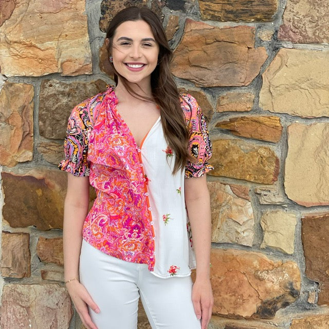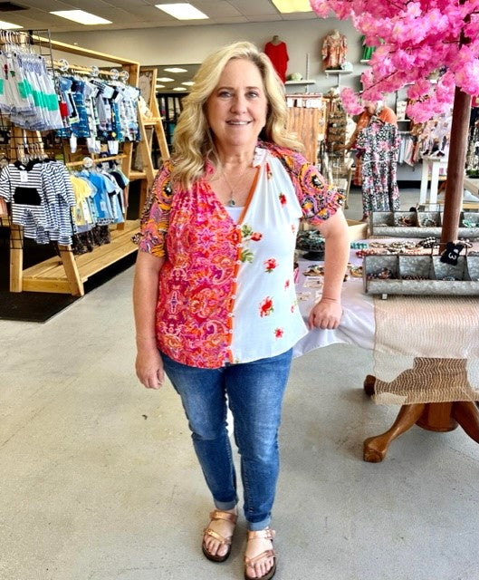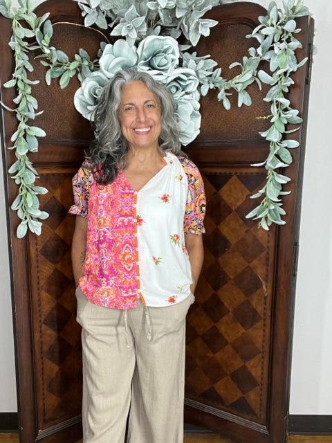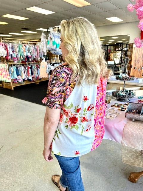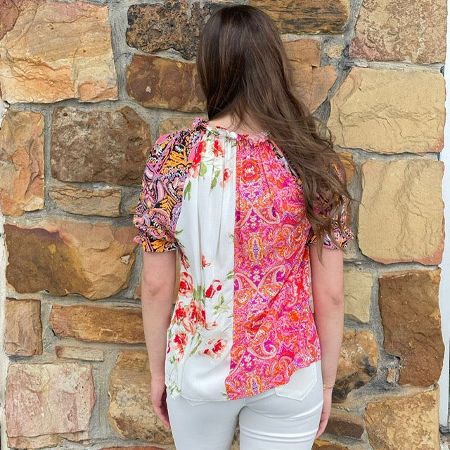 Boho Floral Print Patchwork Buttoned Short Sleeve Top