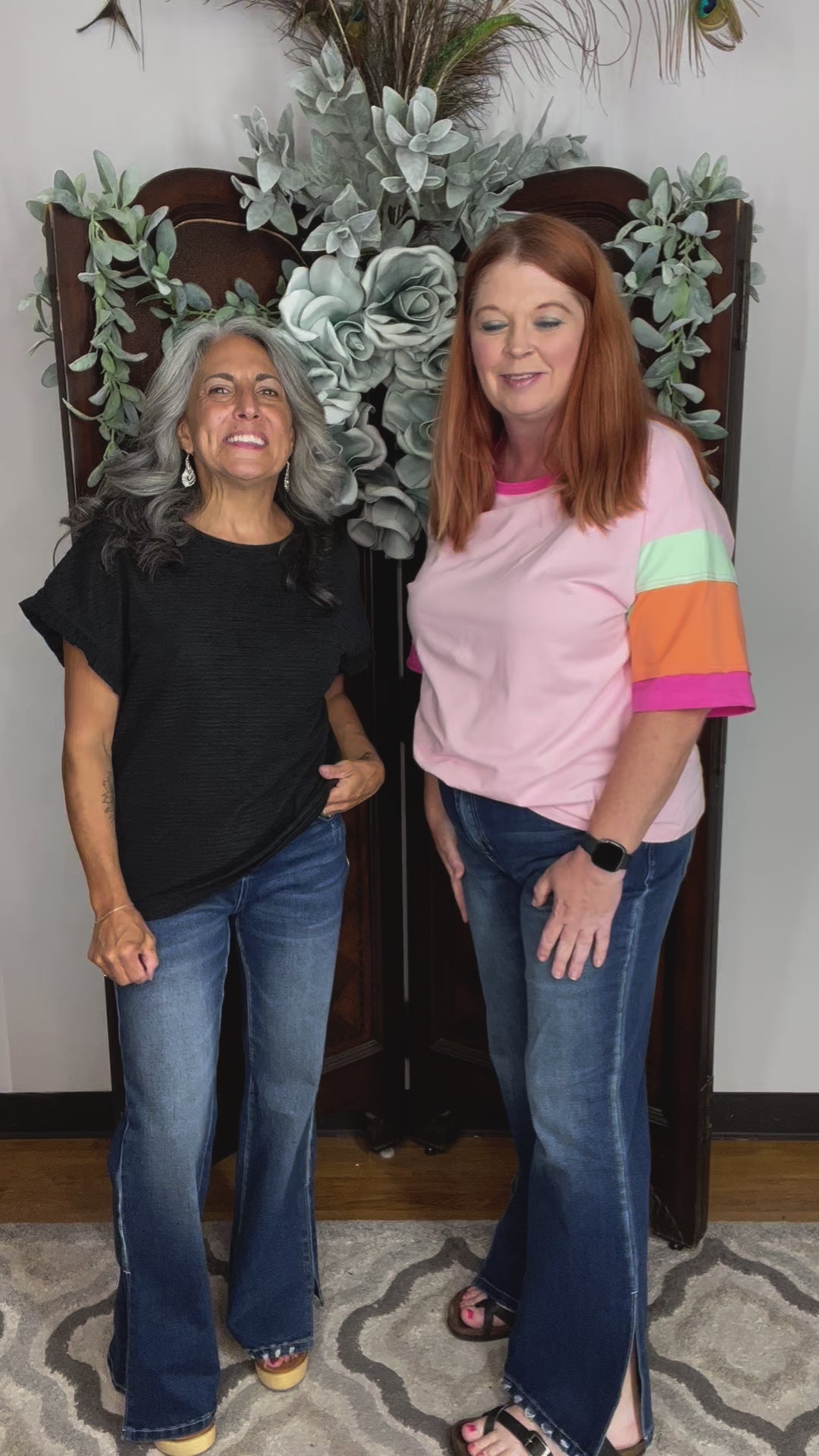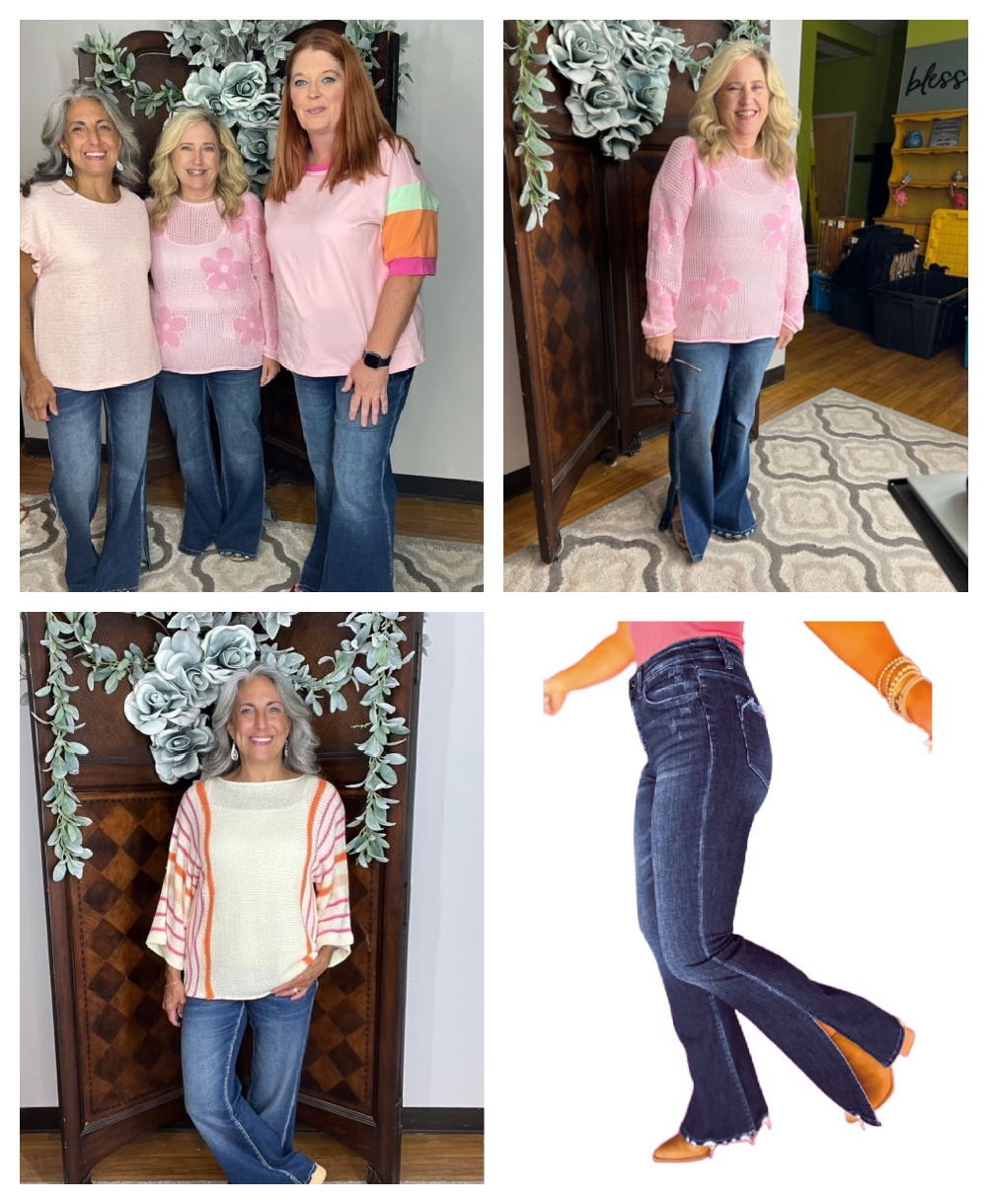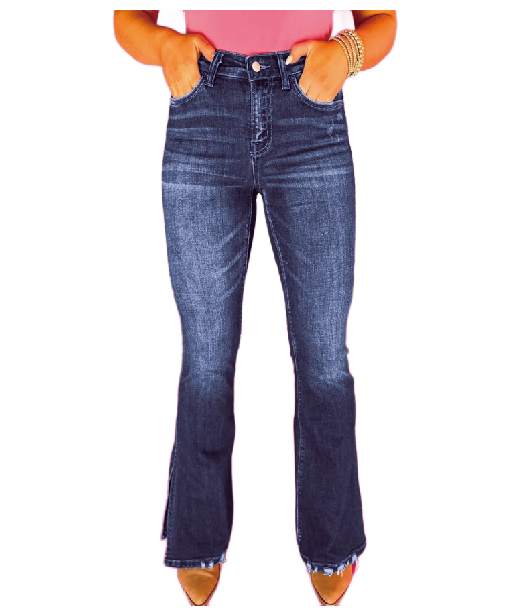 Med Washed Hi-Waist Split Flare Stretchy Denim Jeans