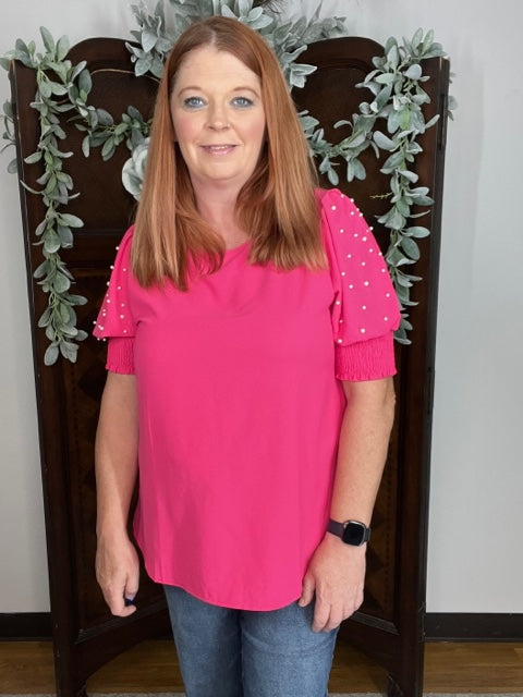Gorgeous Bedecked w Pearl Detail on Puff Sleeve Curvy Top