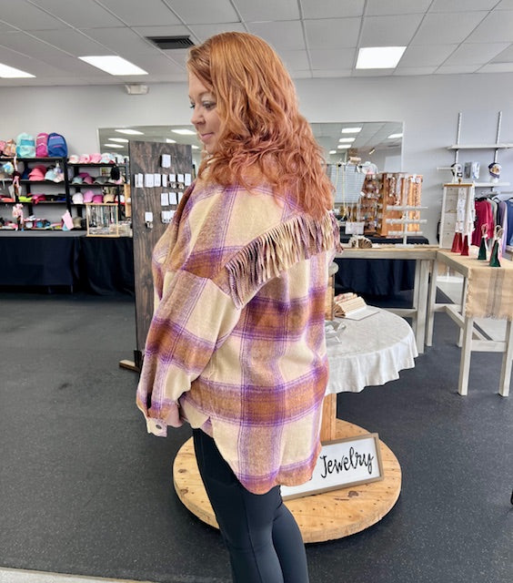 Stylish Plaid Button Down Shacket w Fringe Detail on Back