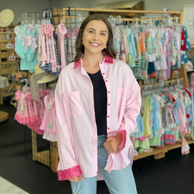 Fantastic Oversized Shirt w Smiley Sequin Patch On Back, Sequin on Collar & Cuff Sleeve