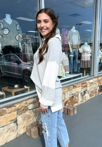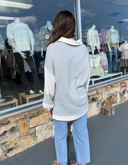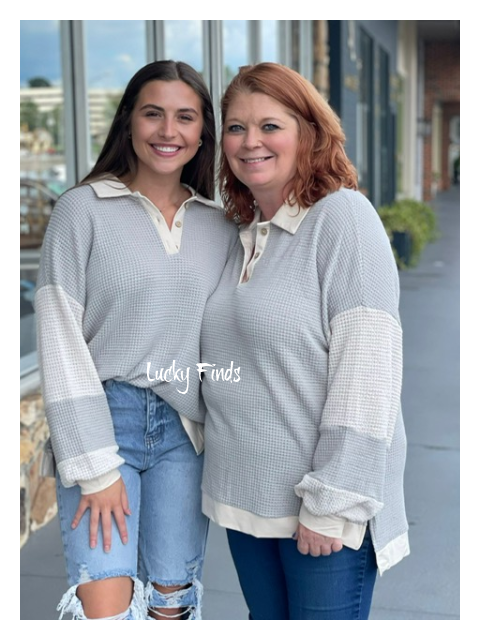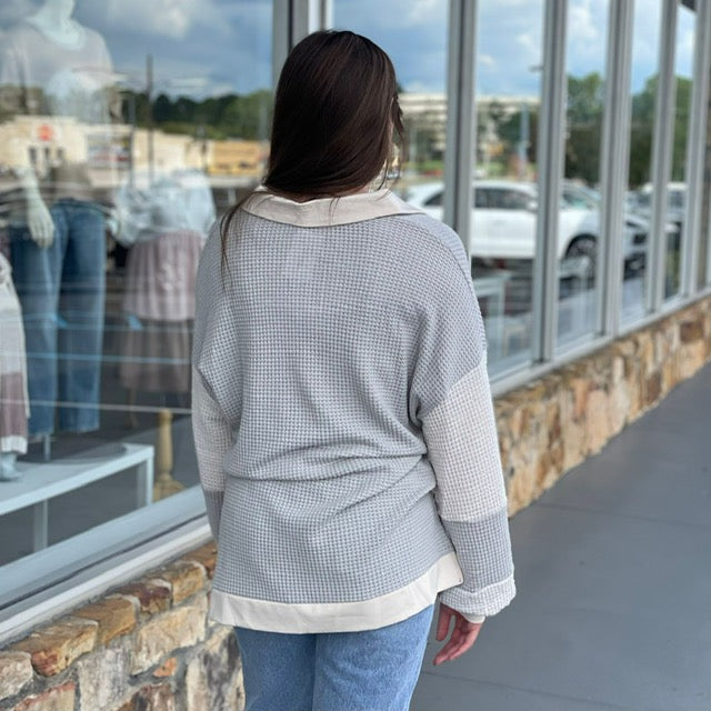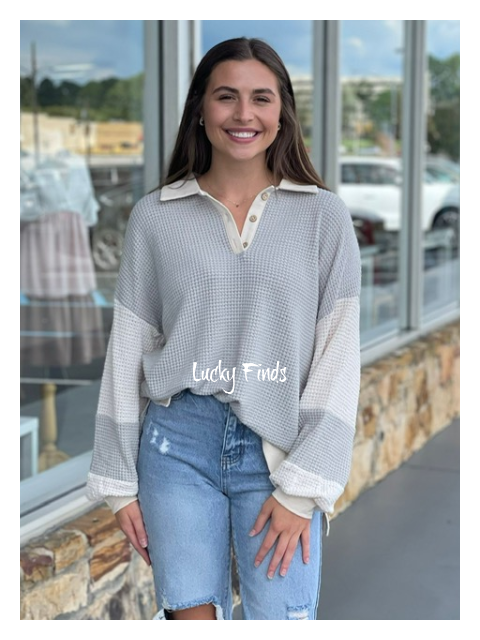 Comfy Oversized Textured Waffle Colorblock Collared Henley Top