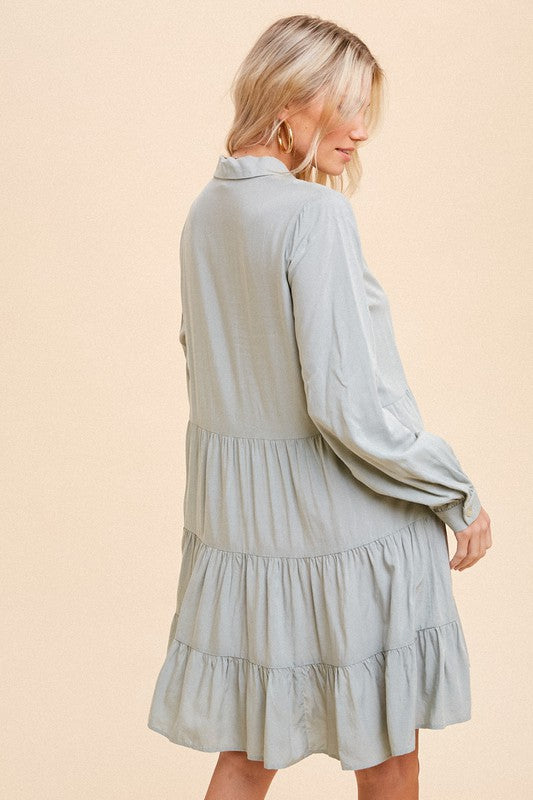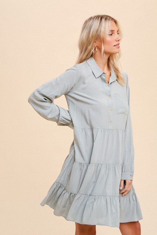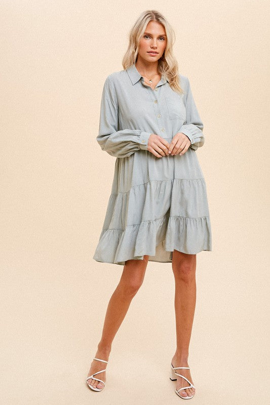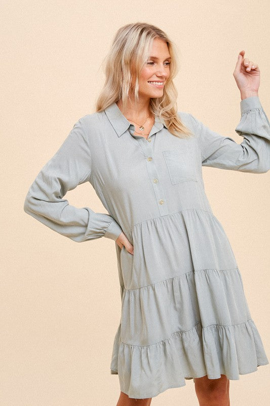Urban Premium Multi-Tiered Ruffle Front Pocket Shirt Dress in Long Sleeves, Style this dress alone as a whimsical boho dress or layer up with a vest for a modern trendy look!