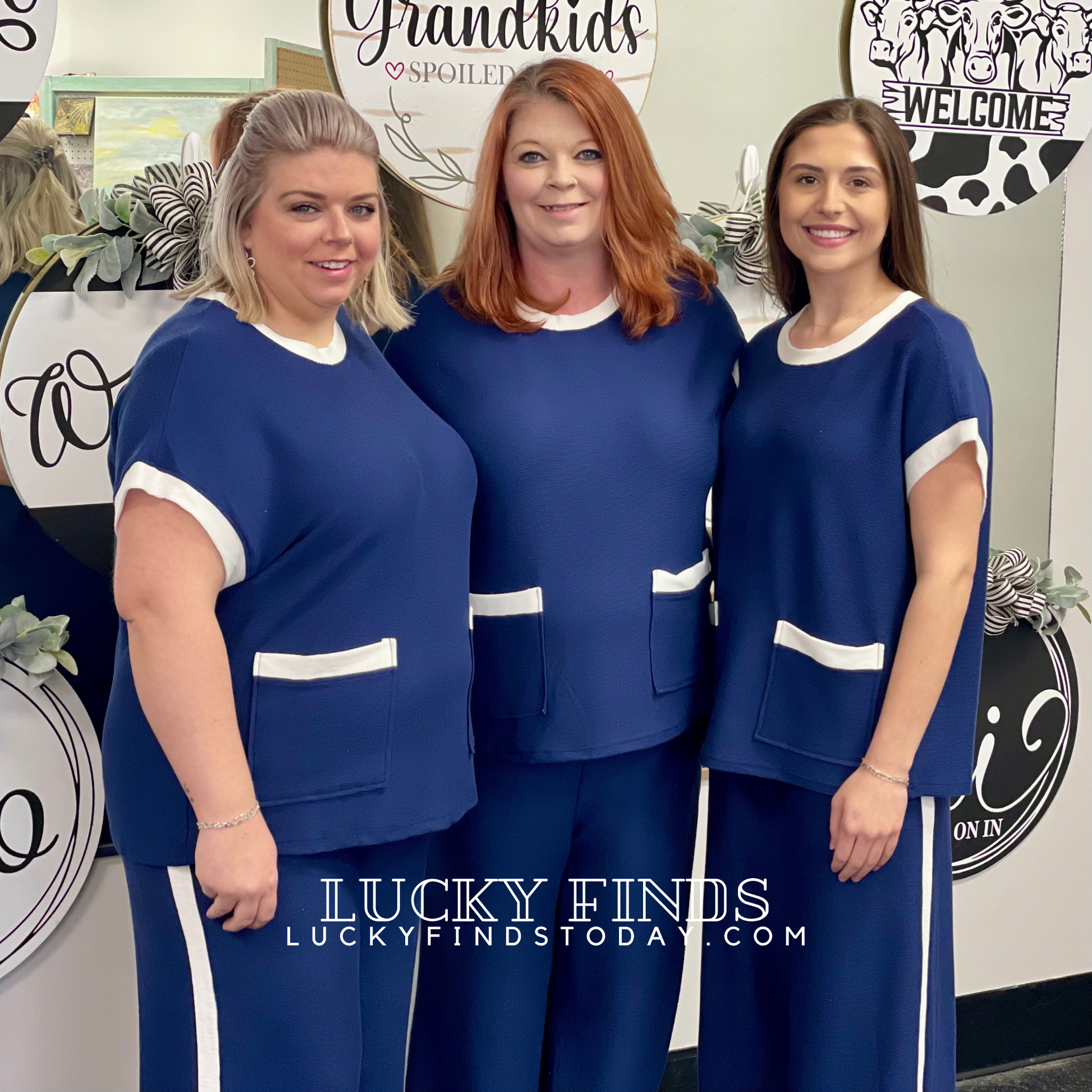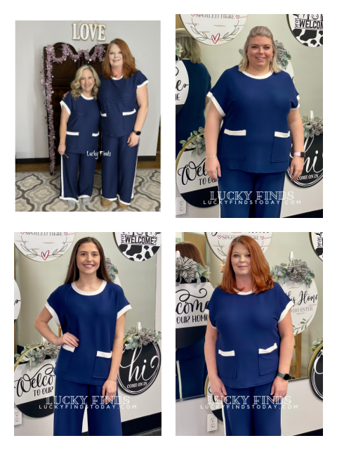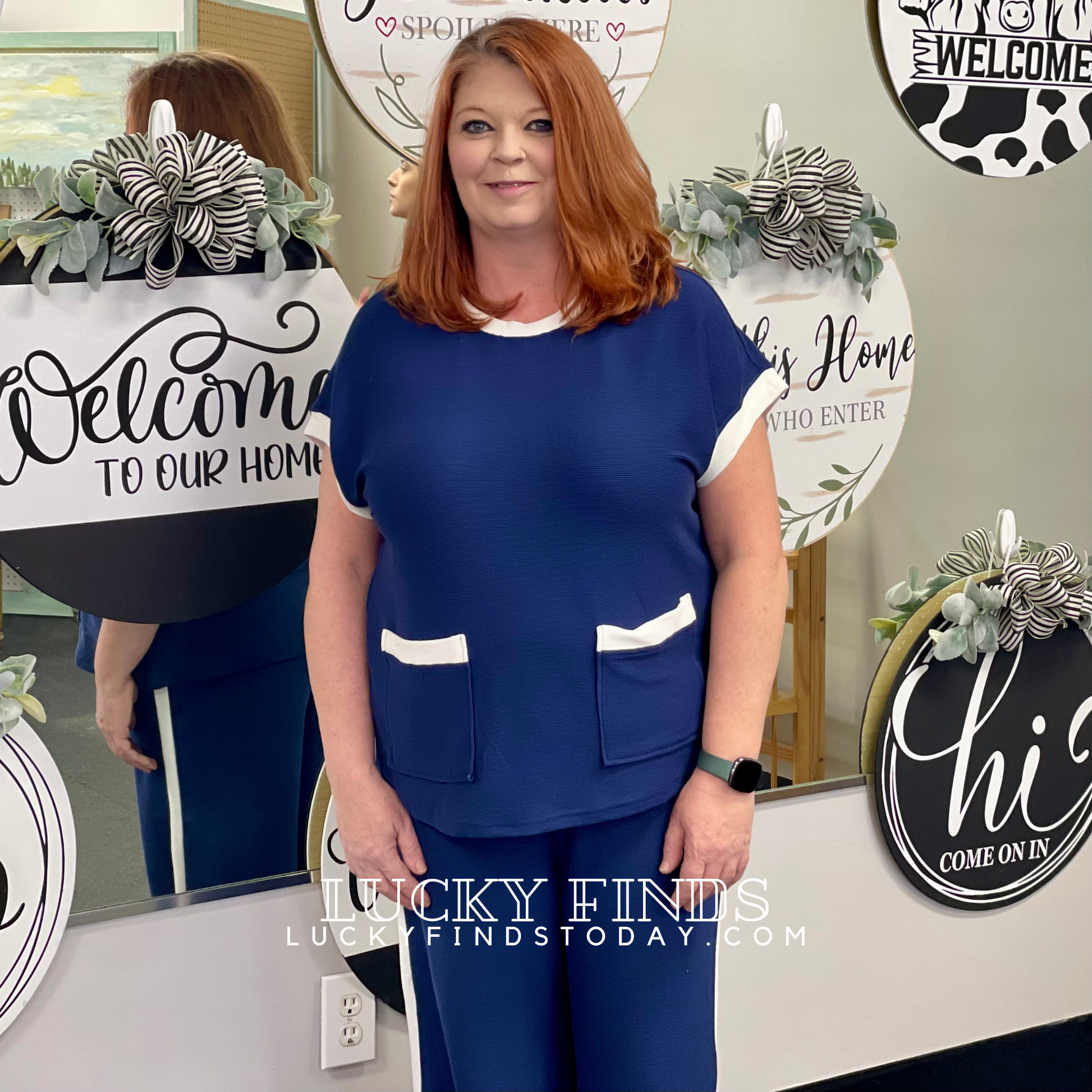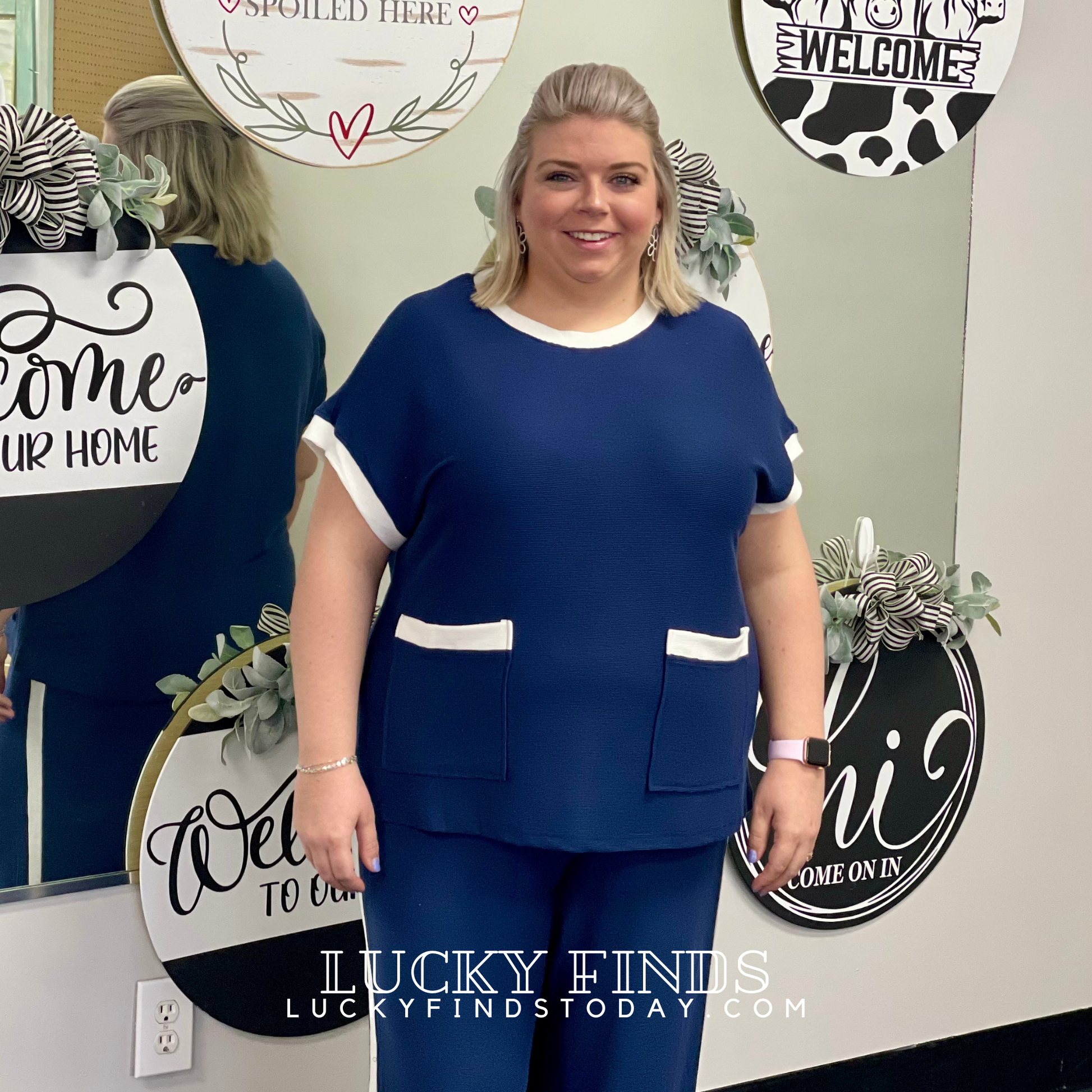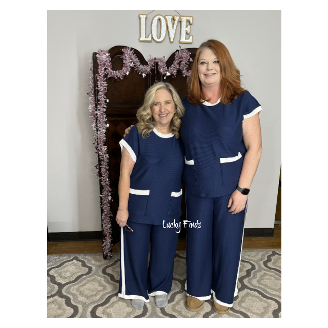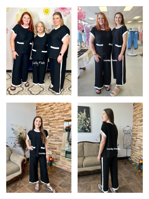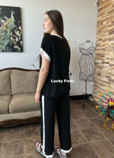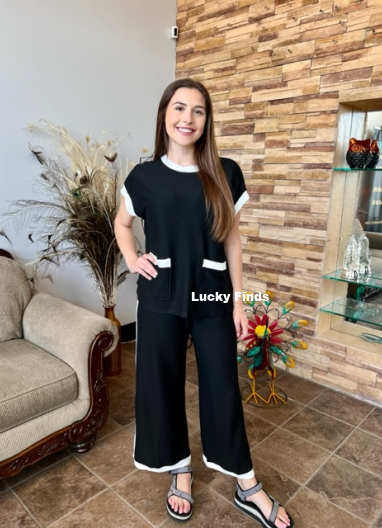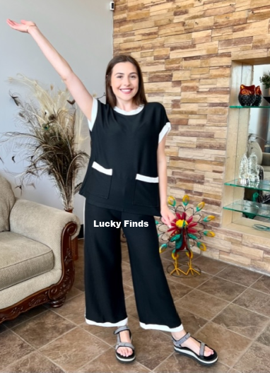 Sooo Cute & Easy to wear Solid Ribbed Color Block Top & Wide Leg Pants Set w Elastic Waistband, Solid contrast trim, Front Pockets & Side Pockets on Pants.