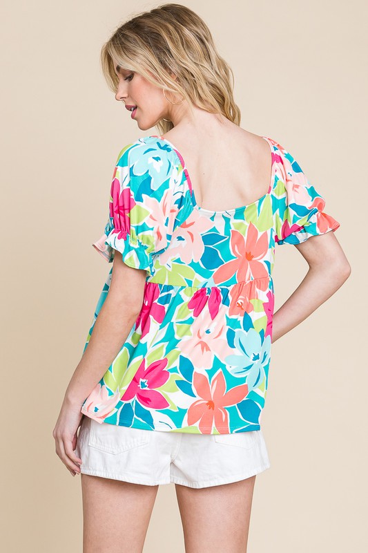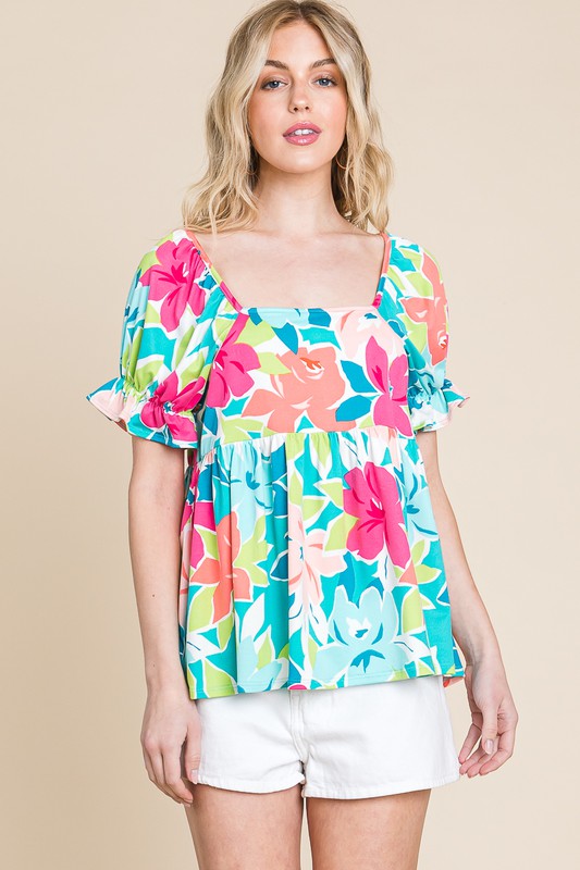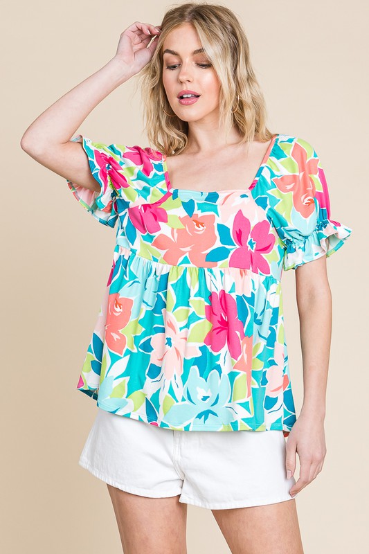 This cute babydoll Curvy top features a playful square neckline and ruffle trim detail, with puffed short sleeves and a floral DTY brushed babydoll design.