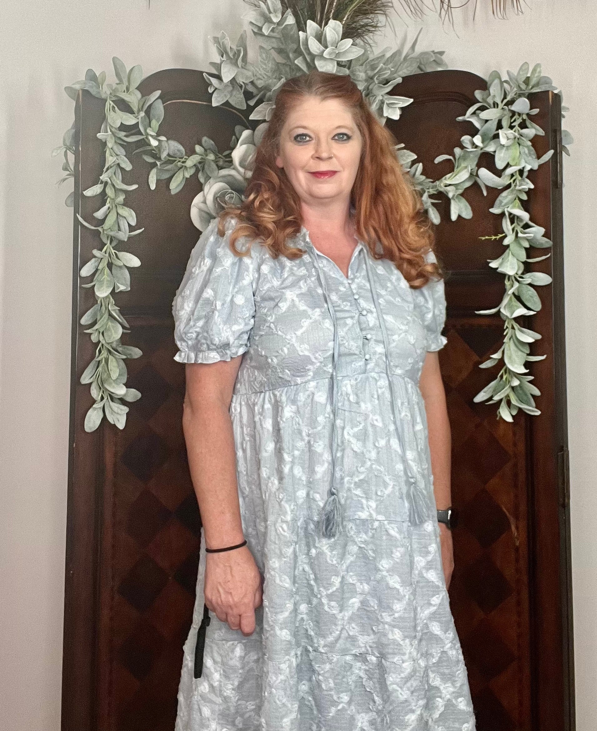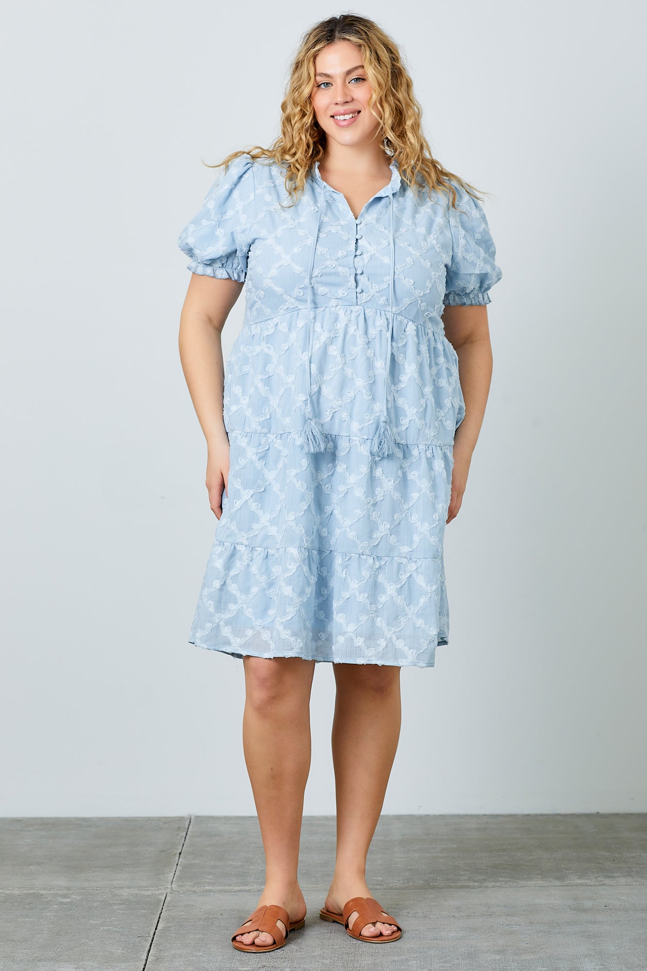 Sophisticated Dapper Novelty Texture Woven Tiered Dress w Puff Sleeve