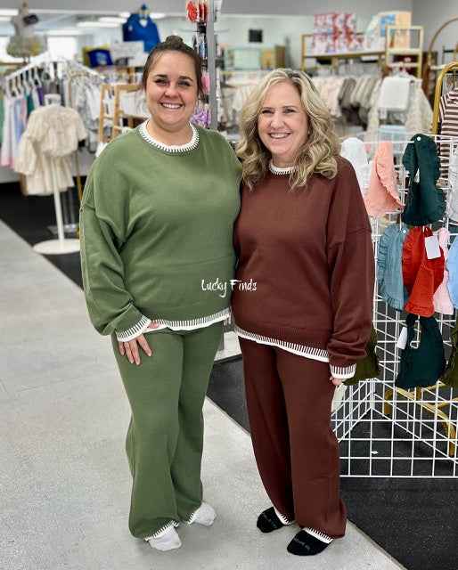 Color Block Trim Details Top & Pants Set w High Elastic Waist Pants, Round Neck Top w Side Slits