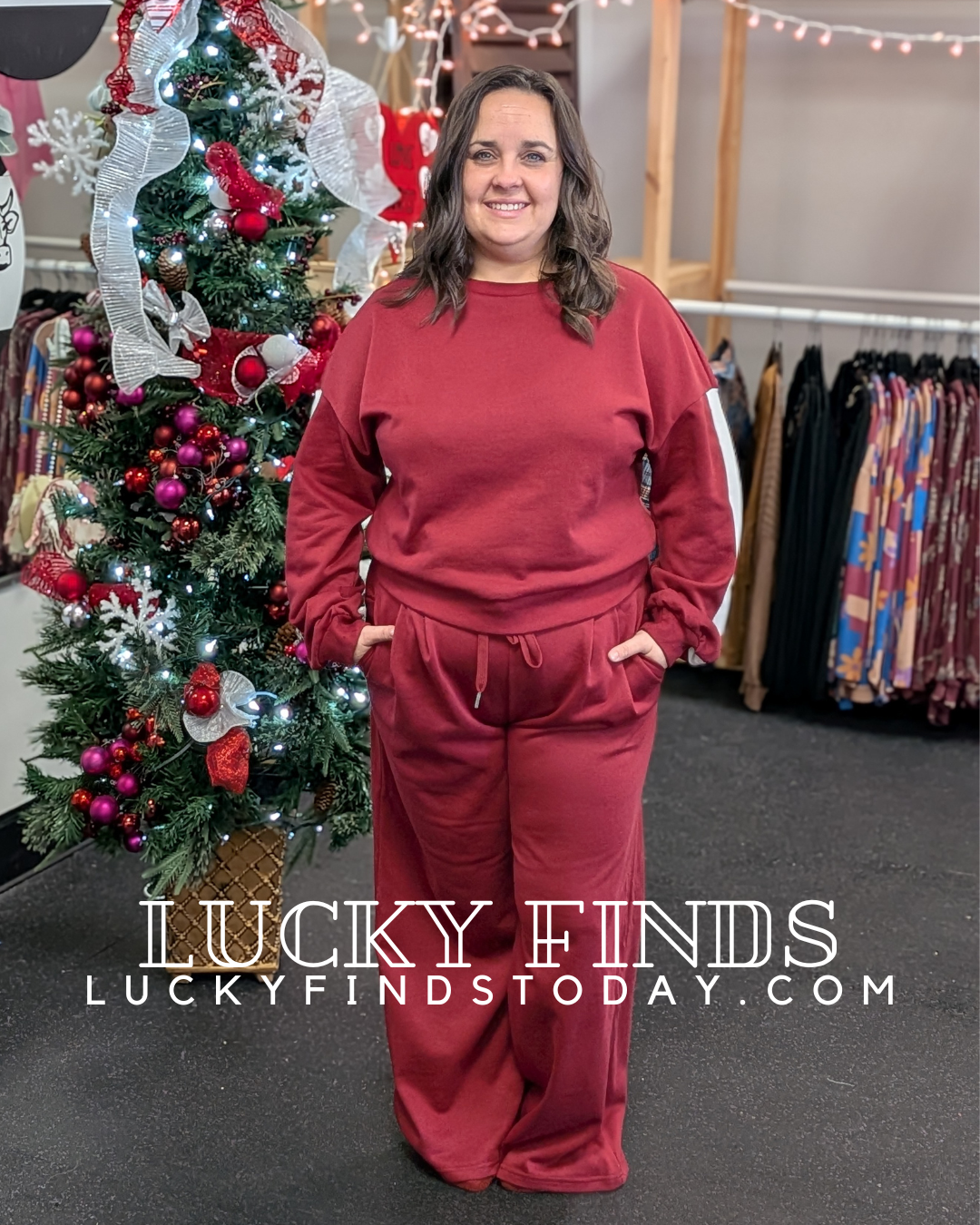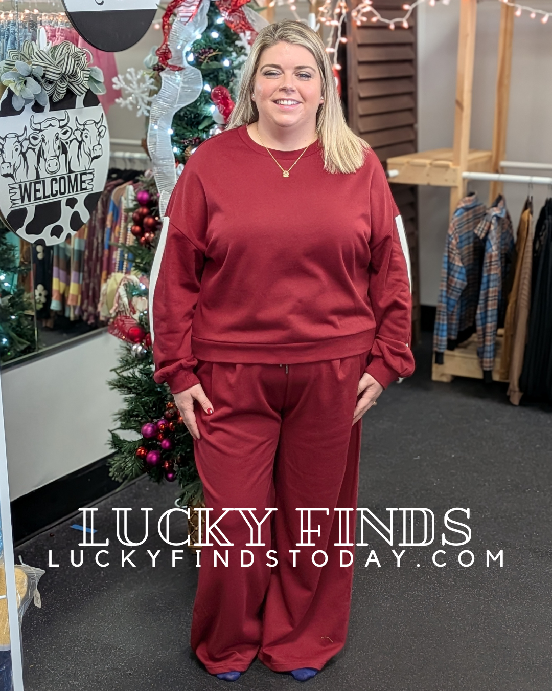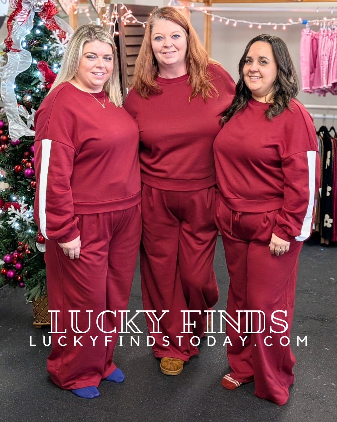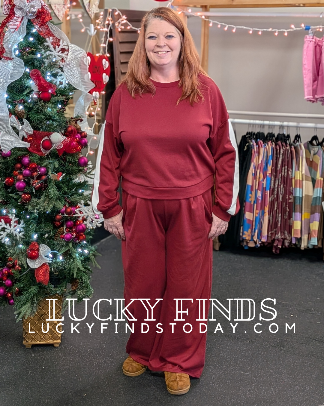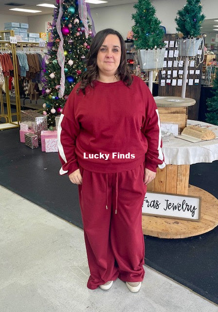 Soft & Comfy Oversized Varsity Striped 3/4 Sleeve Sweatpants Set, Drawstring Pants w Side Pockets, Top w White Stripe on Sleeve