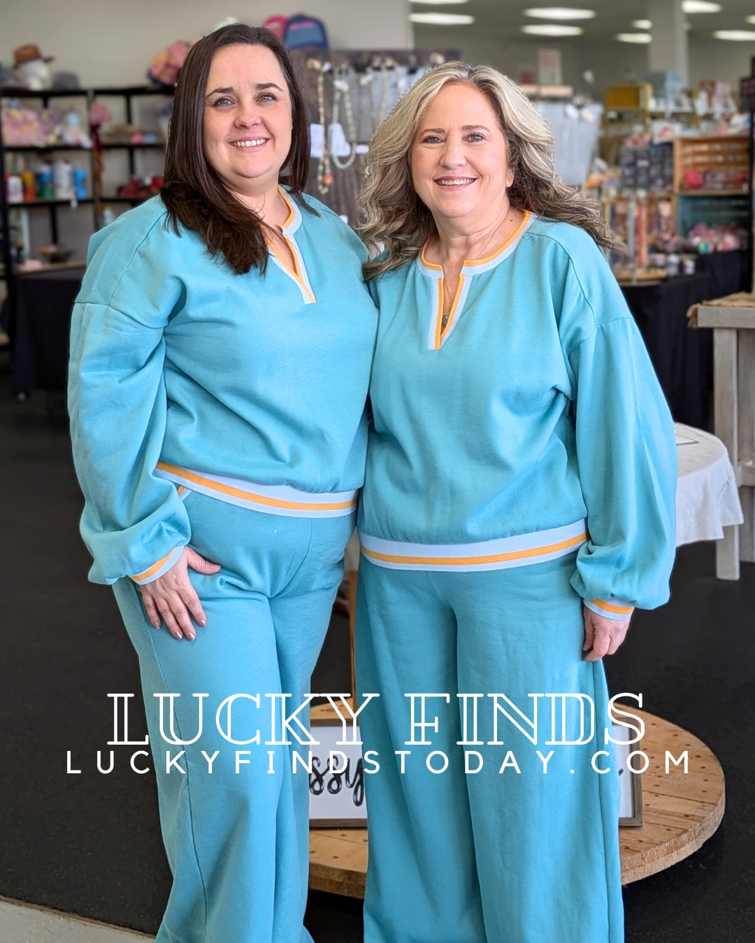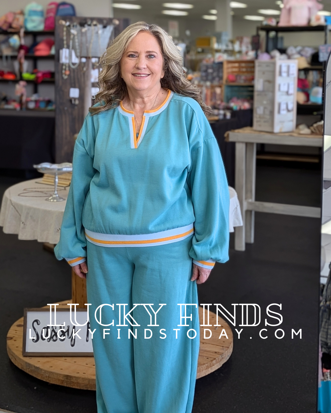 Casual Color Block Band detail Knit Top & Pants Set, Split V-Neck Top & Elastic Waist Pants w Pockets