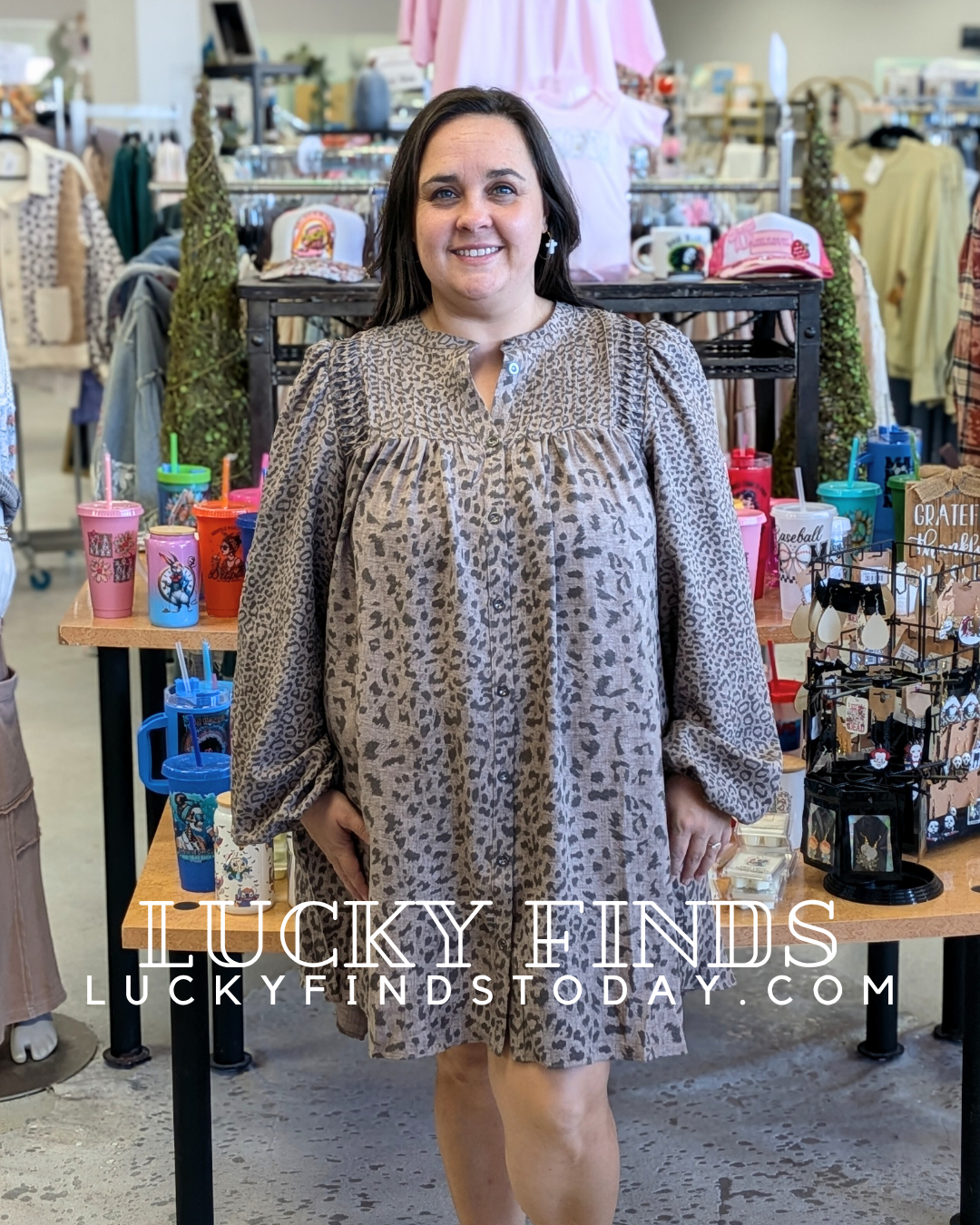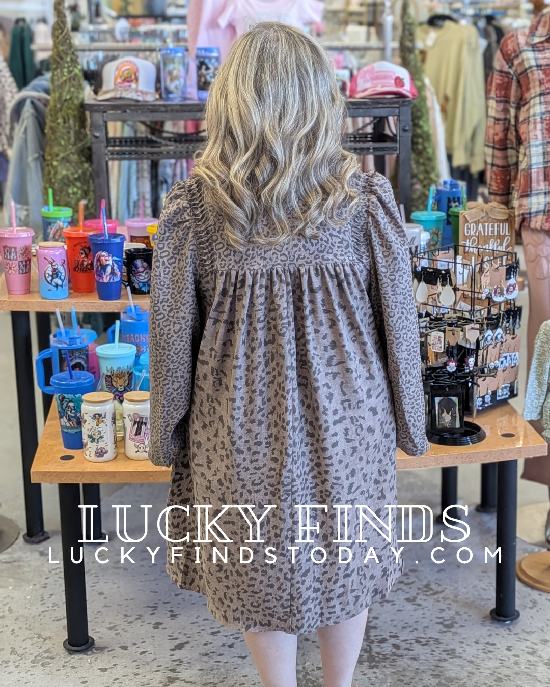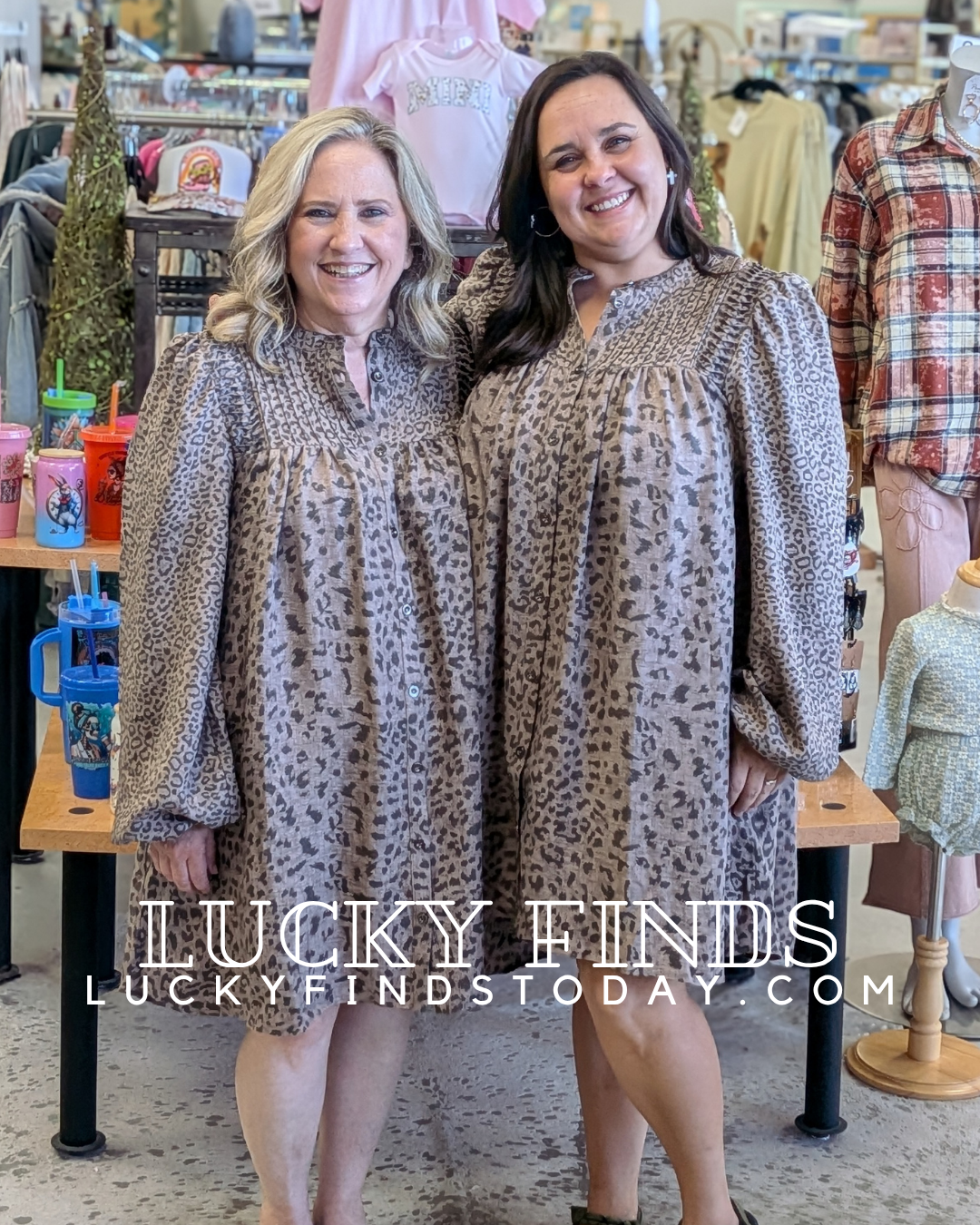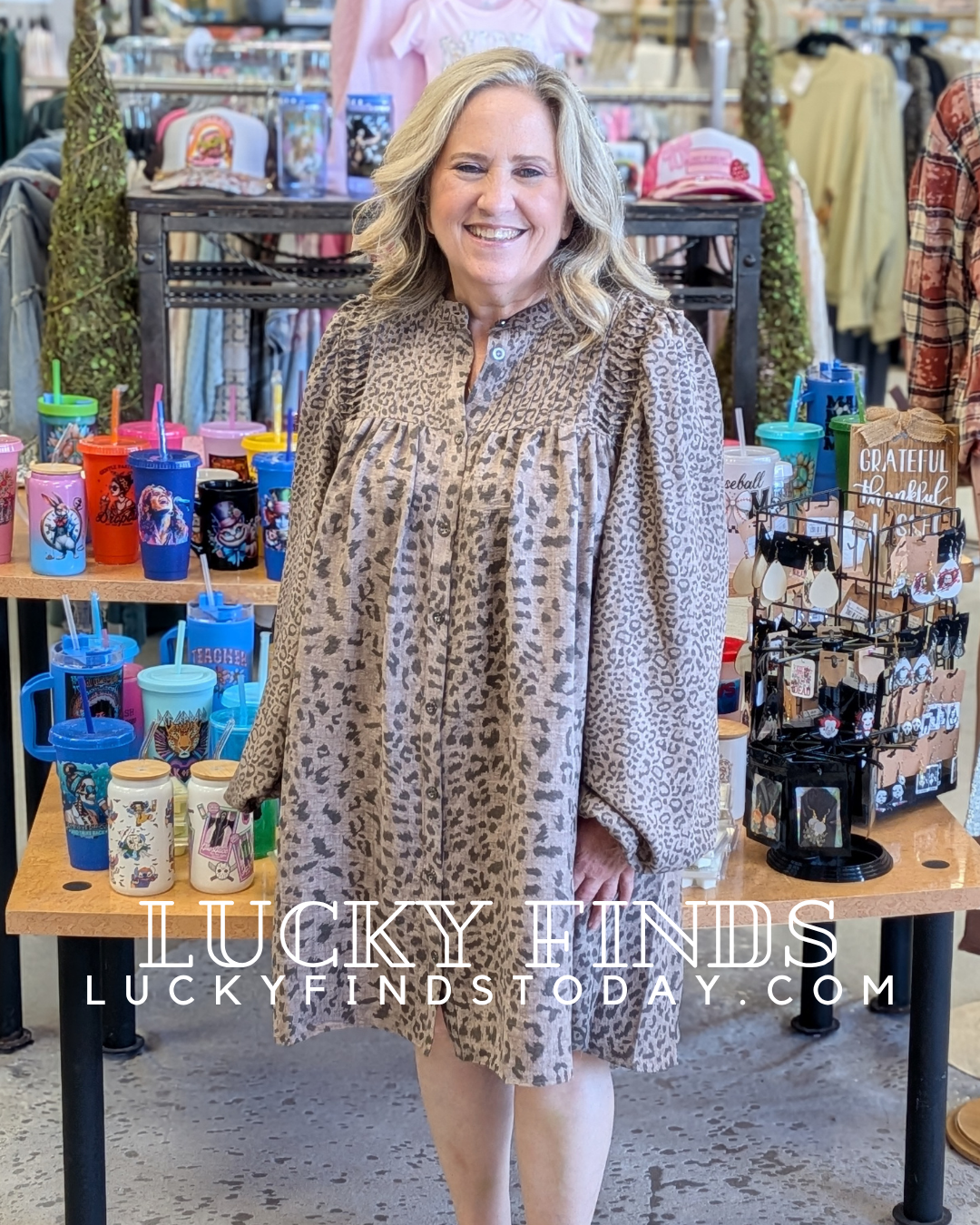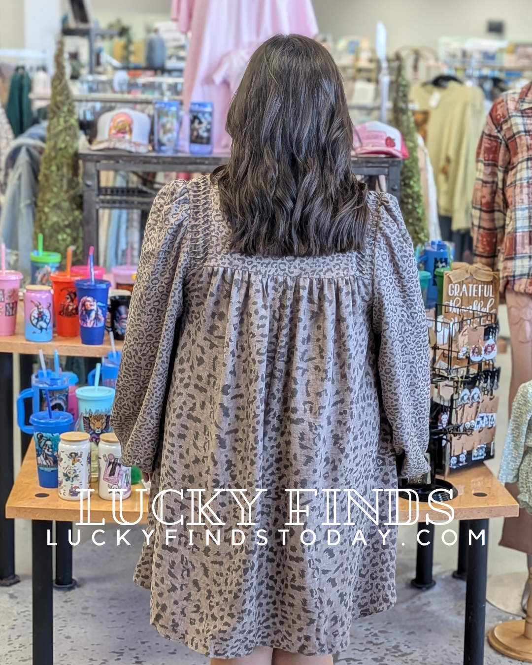 Exquisite Washed Babydoll Animal Print Button Down Swing Dress, Side Pockets, Long Balloon Sleeve w Gathered Elastic Cuffs, Curved H-Low Hemline, Pinktuck Detailing