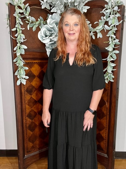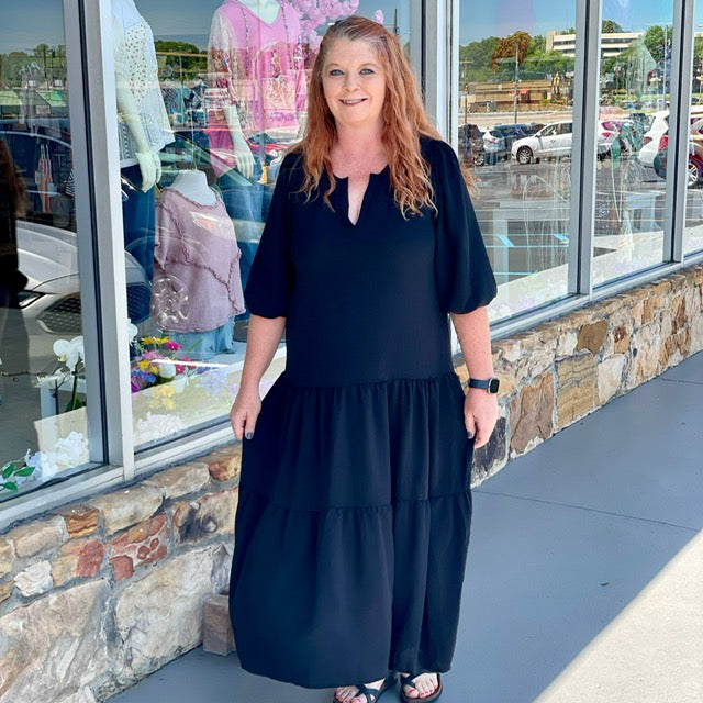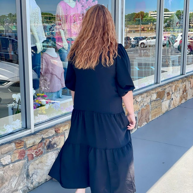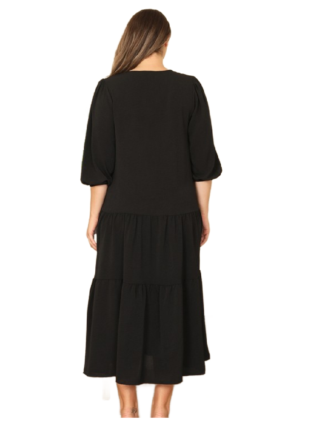 Stylish Curvy notch collar crinkle woven tiered midi dress w 3/4 Sleeve