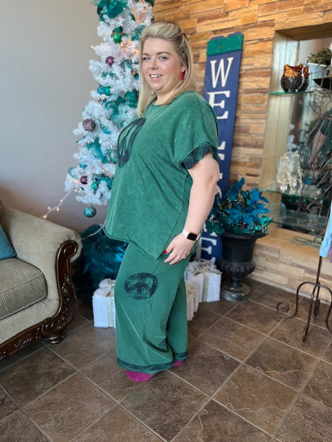 Washed French Terry Checked Peace Applique Wide Leg Pants, Elastic Waist Band, Pockets