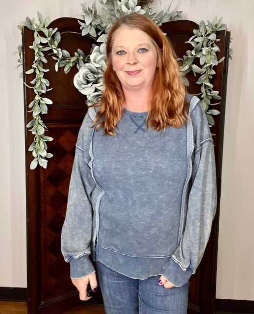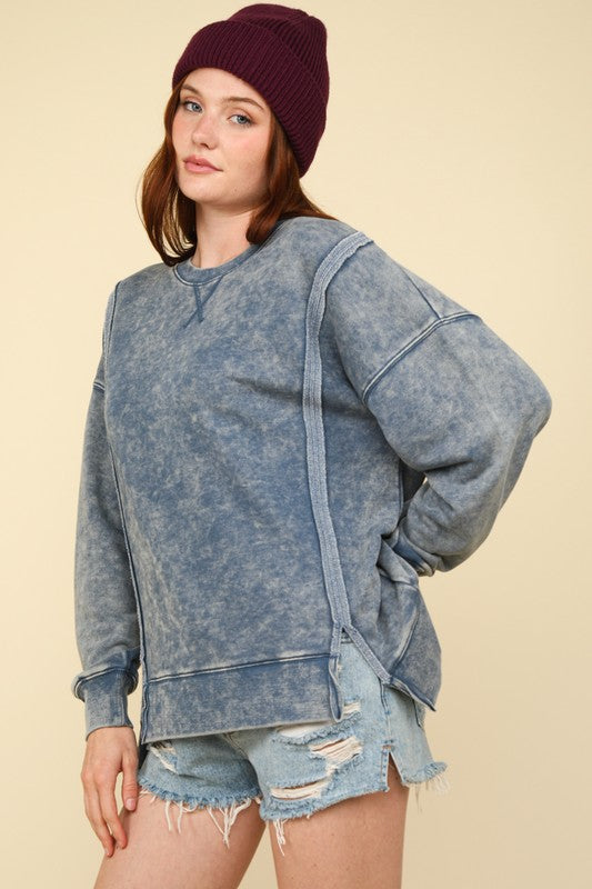 Mineral Washed French Terry Oversized Top w Stitches & Side Slits Details