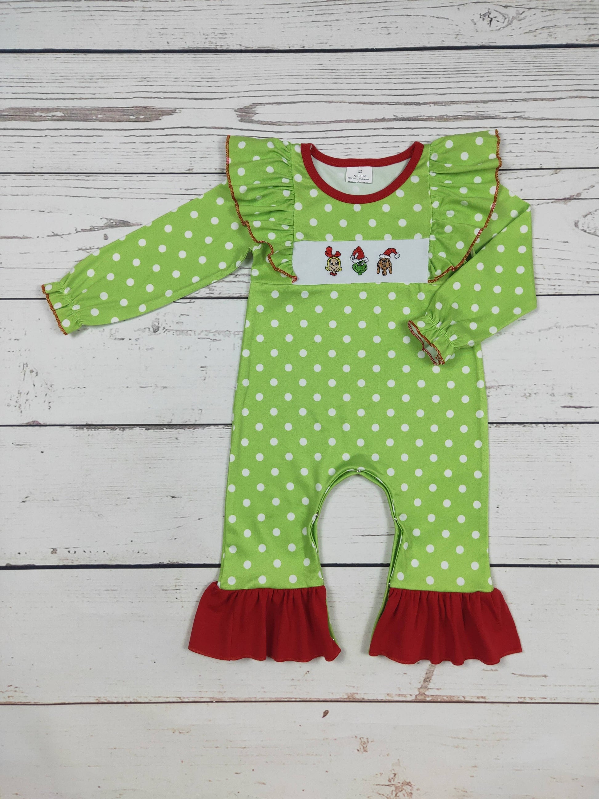 Polka Dots Character Appliqué Christmas Romper ETA: 3-5 Days This adorable romper features a playful polka dot design and charming character appliqués, making it a must-have for the holiday season. Plus, with an estimated delivery time of just 3-5 days, you can have your little one looking festive in no time!