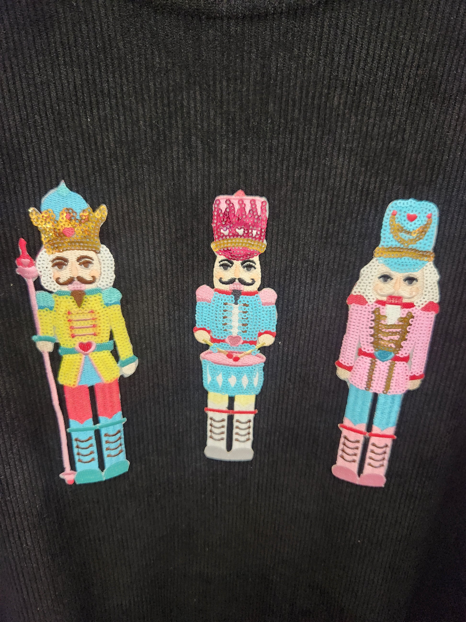Sequin nutcracker sweatshirt. Long sleeve with multi color patch. Avail in sizes Medium to 2XL