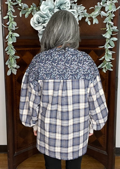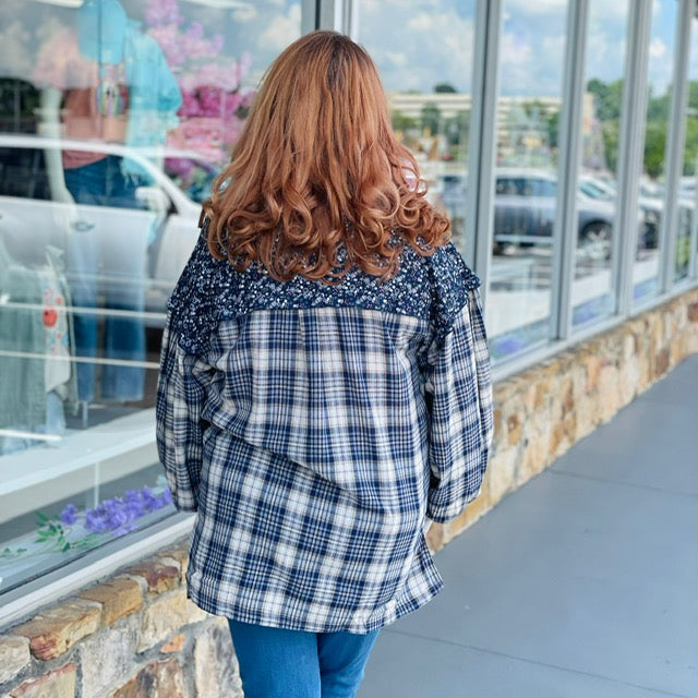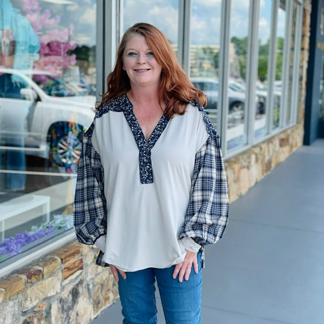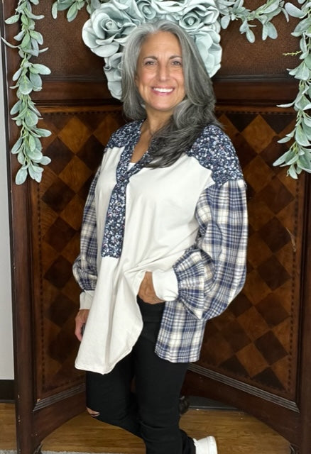Gorgeous Floral Plaid Mixed Print Patchwork Henley Top, Contrast Details & Bishop Sleeve