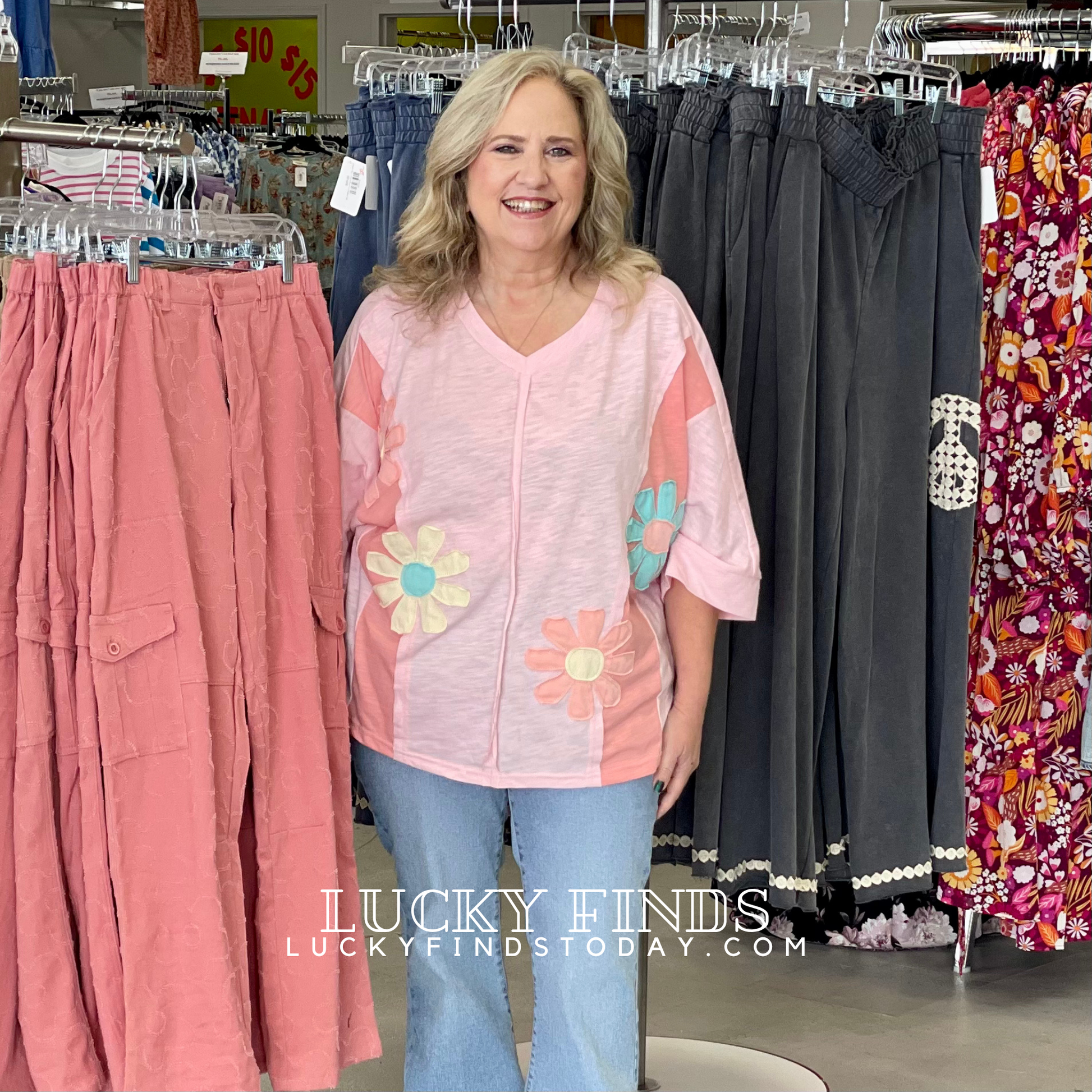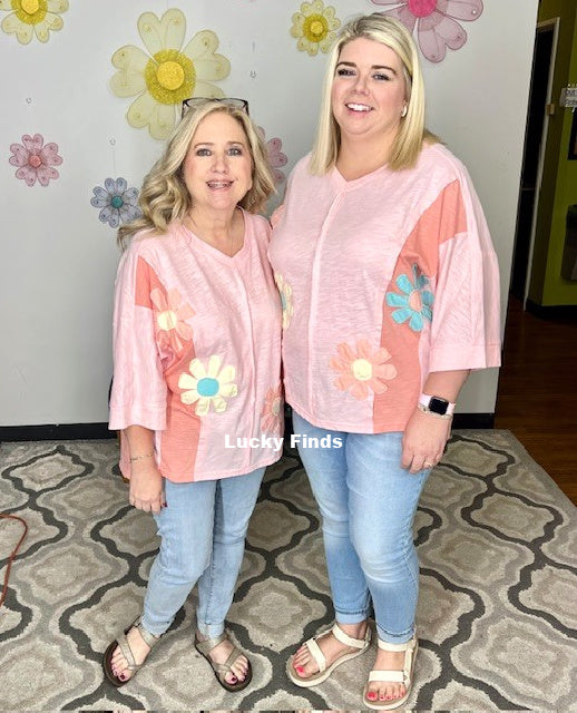 Oversized Flower Colorblock Patchwork Top w 3/4 Sleeves & Exposed Seams